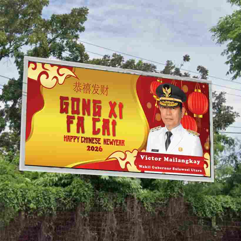 Baliho bertema Imlek ini berukuran besar berbentuk persegi panjang horizontal, didominasi warna merah dan emas yang identik dengan perayaan Tahun Baru...