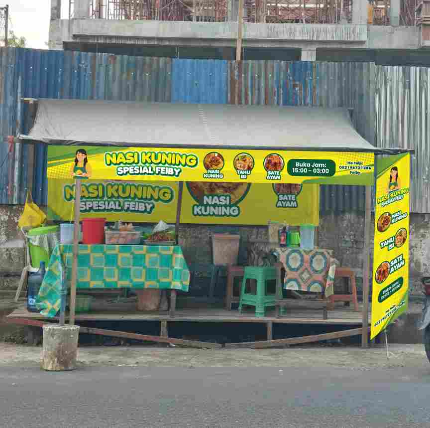 Baliho UMKM Nasi Kuning untuk Warung Hijau Kuning berbentuk persegi panjang horizontal yang dipasang di bagian depan warung, didominasi warna hijau da...