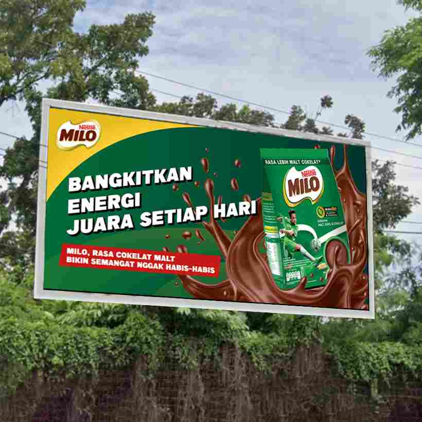 Baliho billboard promosi Milo menampilkan kemasan produk minuman cokelat malt berukuran besar dengan dominasi warna hijau dan cokelat, dipadukan denga...