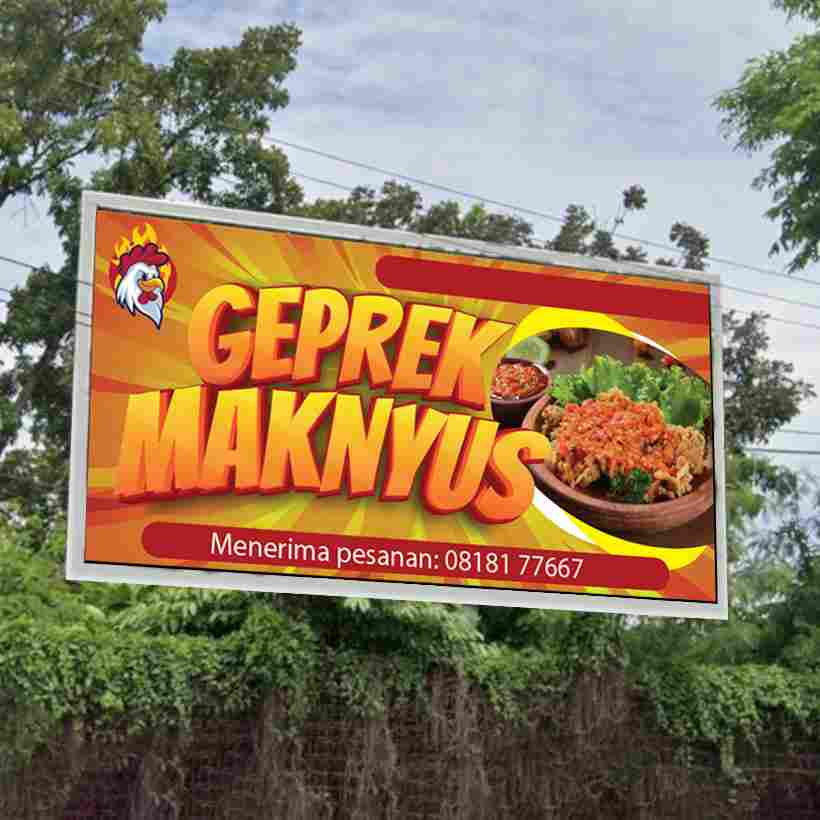 Baliho bertema kuliner ini menampilkan judul besar “Geprek Maknyus” dengan warna oranye dan kuning yang sangat mencolok, dipadukan efek sinar dan ilus...
