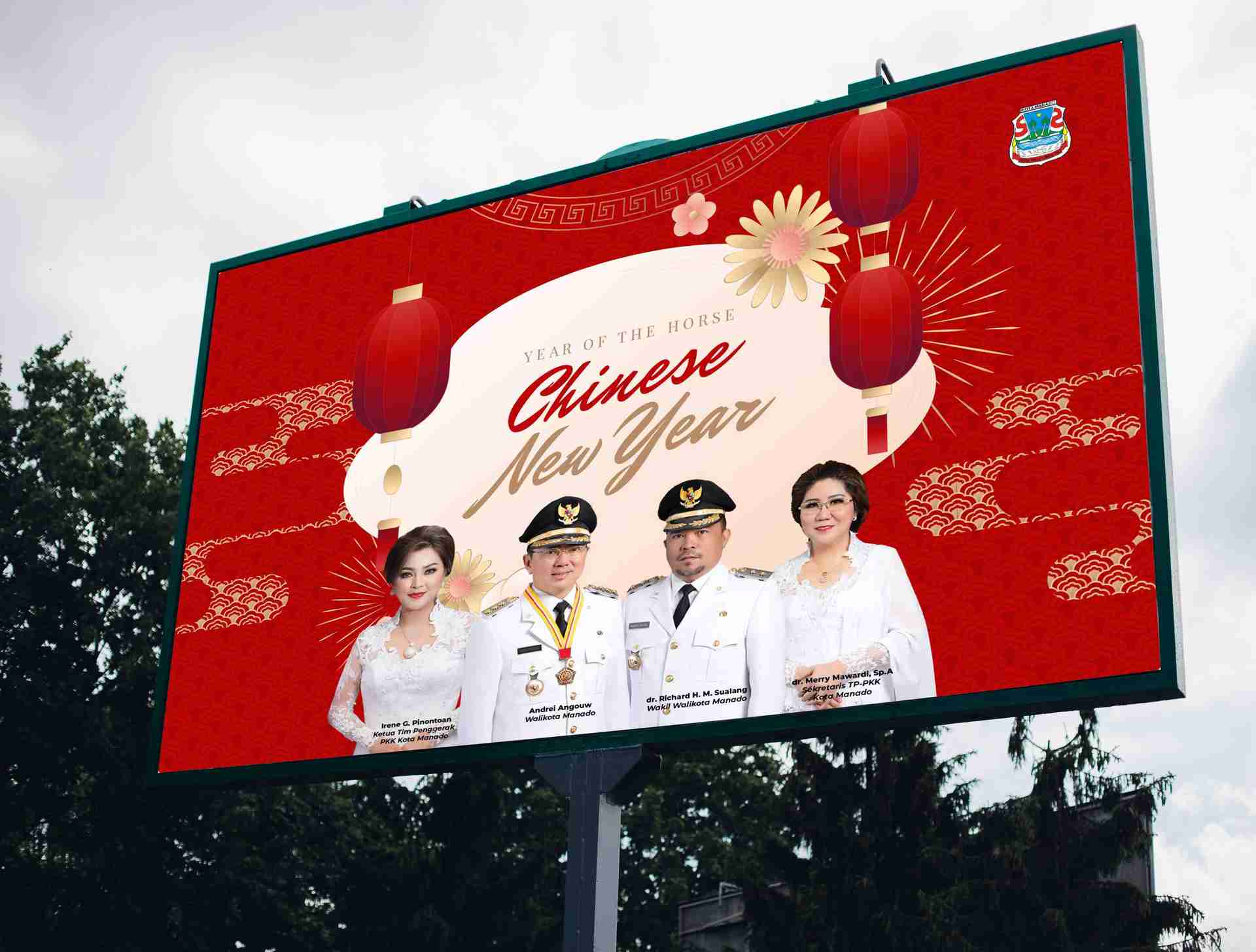Billboard baliho ucapan Chinese New Year dengan tema Year of the Horse ini berbentuk persegi panjang besar, didominasi warna merah cerah dengan orname...