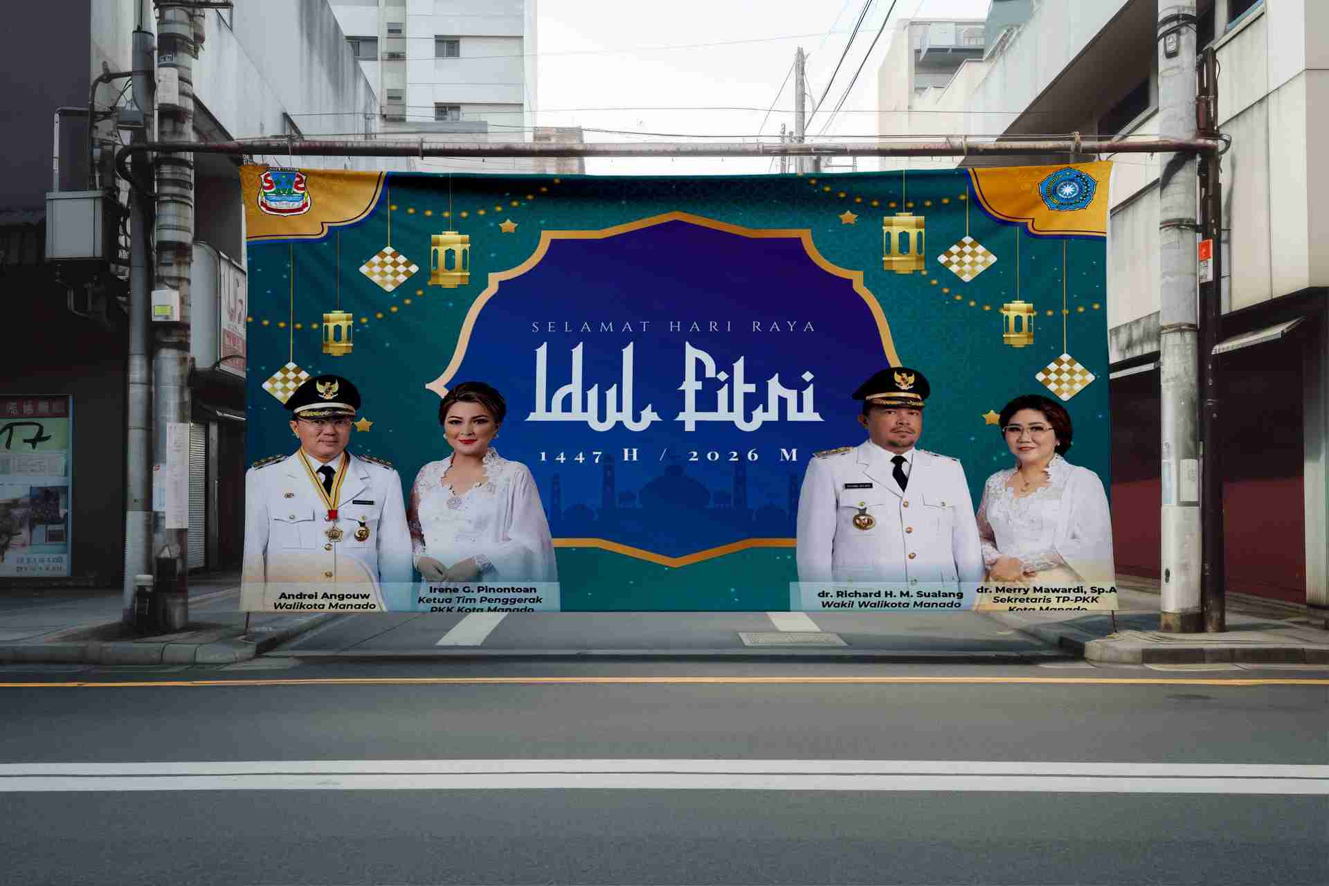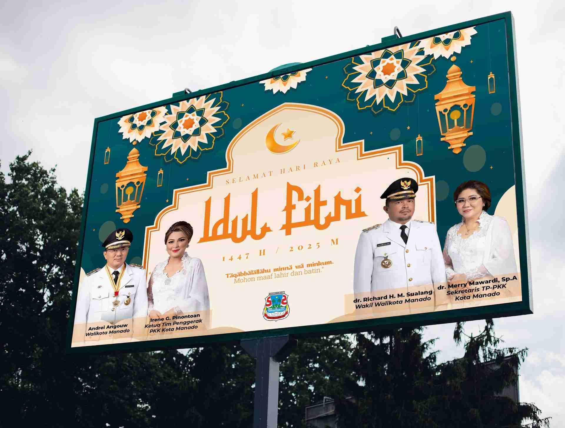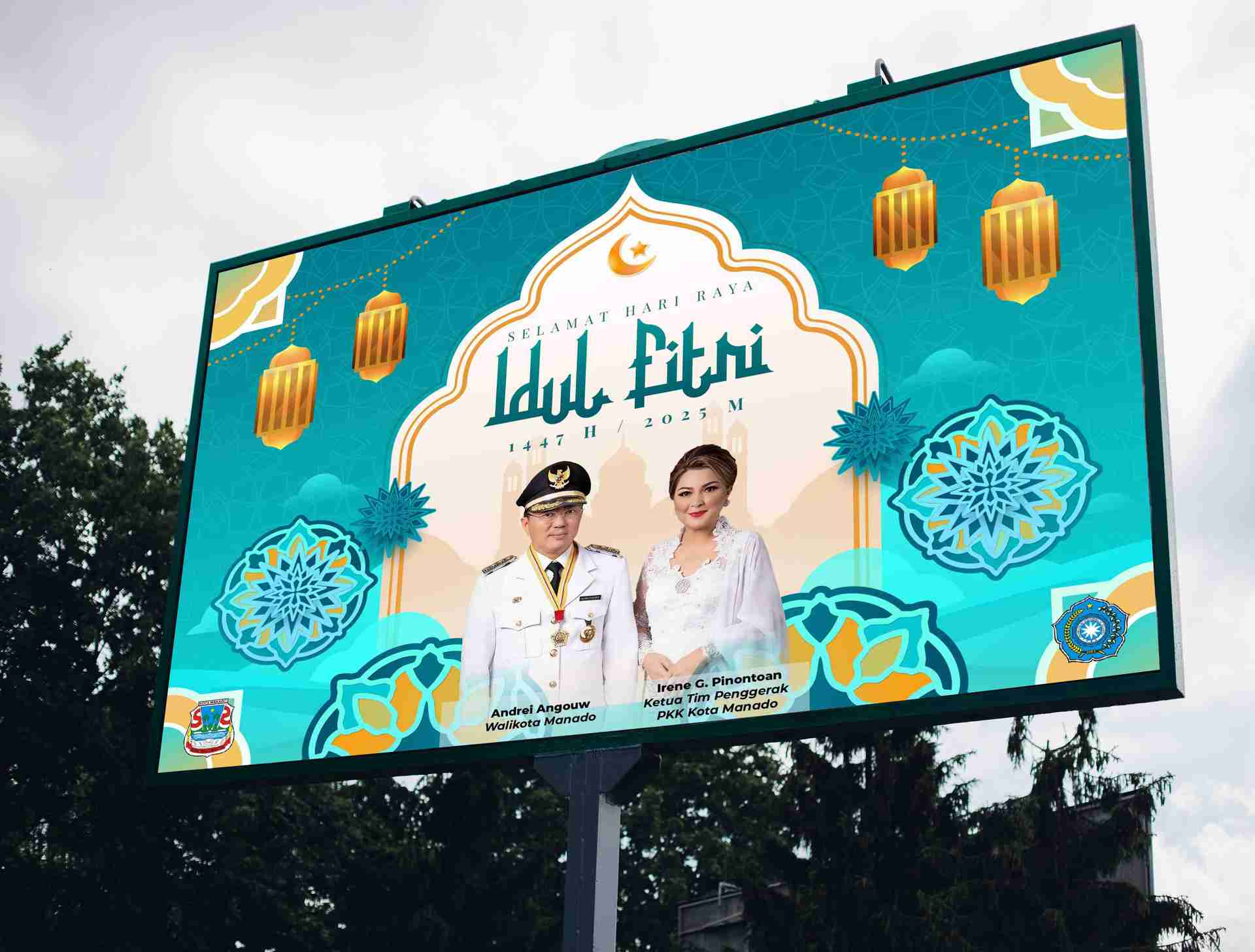 Billboard ucapan Selamat Hari Raya Idul Fitri 1447 H / 2026 M oleh Pemerintah Kota Manado ini berbentuk persegi panjang besar dengan dominasi warna hi...