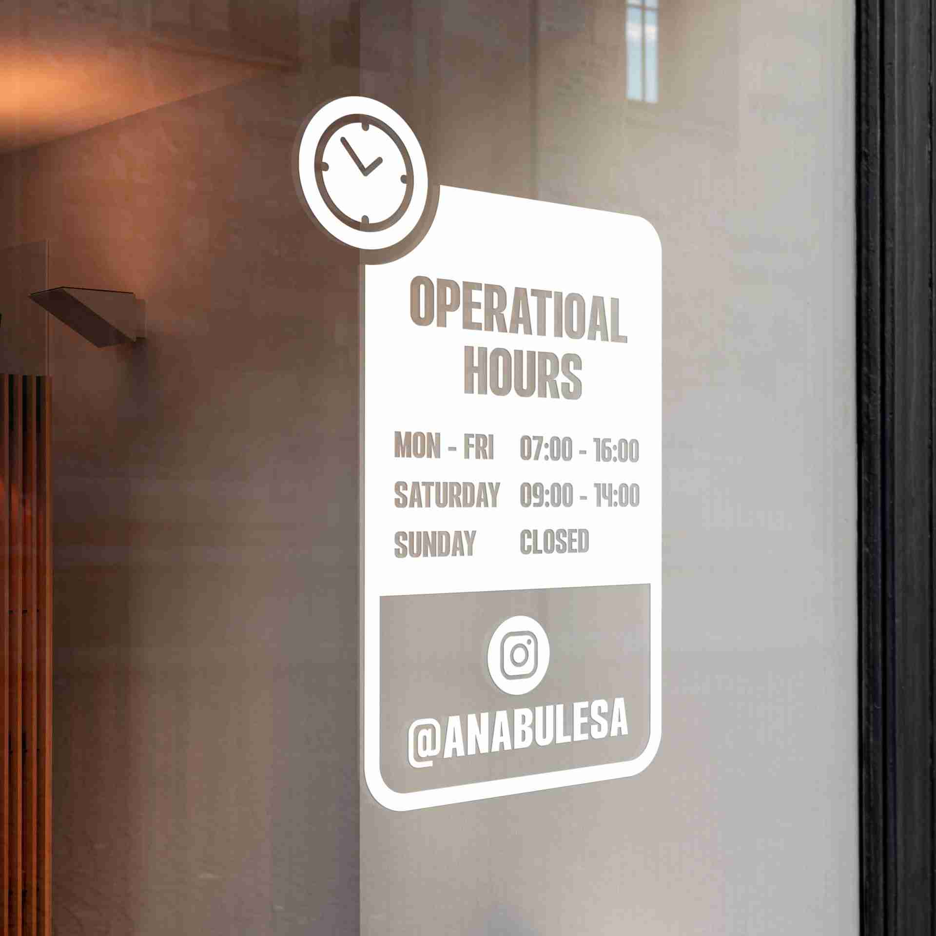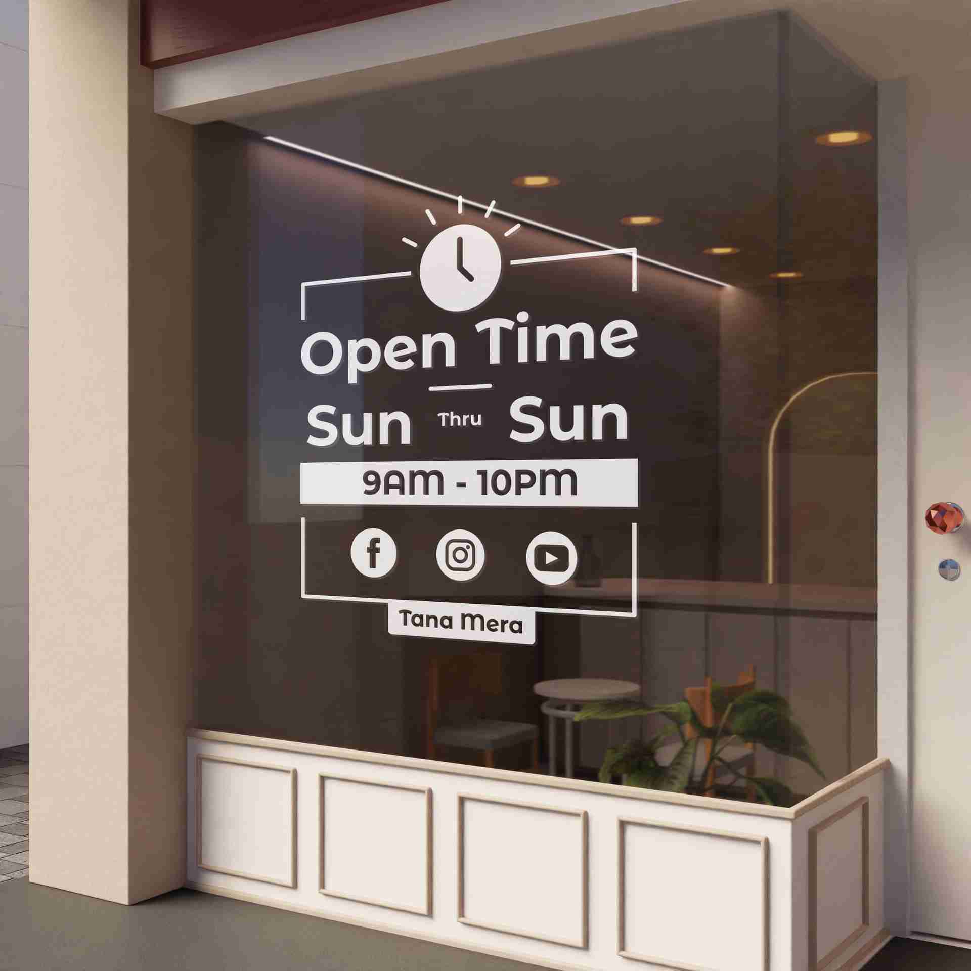Stiker Jam Operasional – Seri Street Window berbentuk persegi panjang dengan dominasi warna putih, menampilkan informasi jam buka toko atau usaha seca...