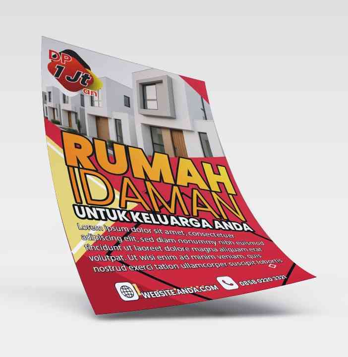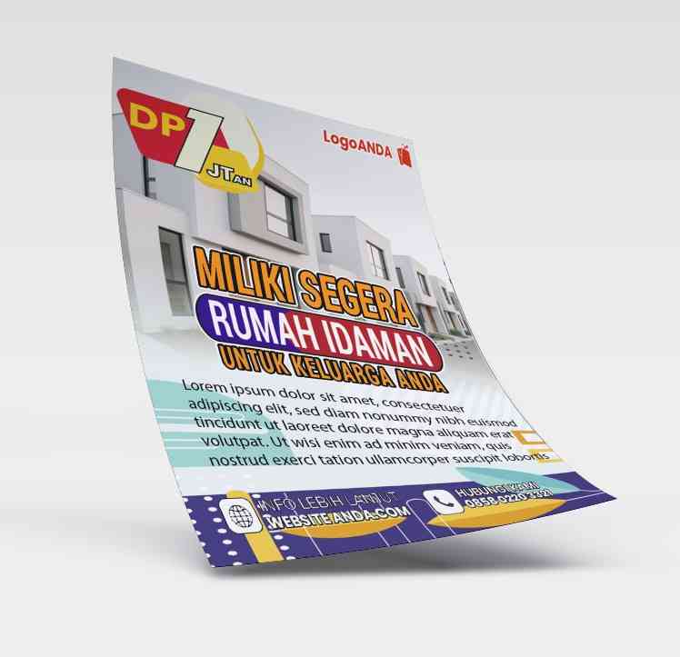 flyer brosur promosi properti bergaya modern dan minimalis sebagai media promosi, menampilkan slogan “Miliki Segera Rumah Idaman untuk Keluarga Anda”. Desain ini menggunakan kombinasi warna yang mencolok untuk menarik perhatian publik secara maksimal. Terdapat visual rumah dua lantai berarsitektur kontemporer yang menonjolkan kesan elegan dan kekinian dengan.