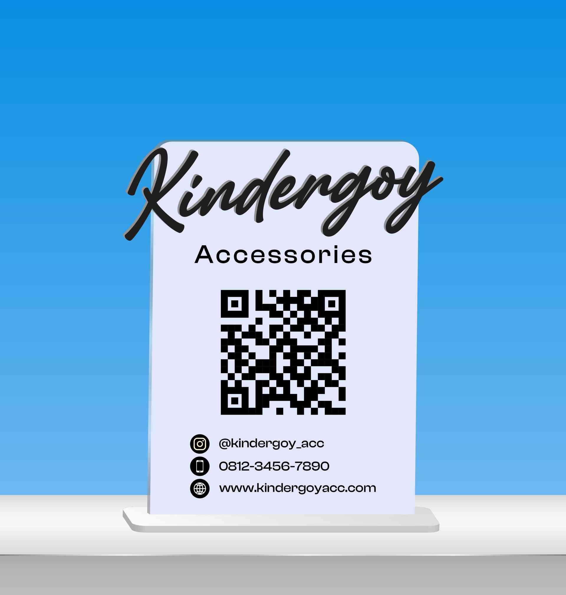 Acrylic QR Minimalist Accessories berupa display akrilik berbentuk persegi panjang dengan sudut membulat, didominasi warna putih dan hitam pada teks s...