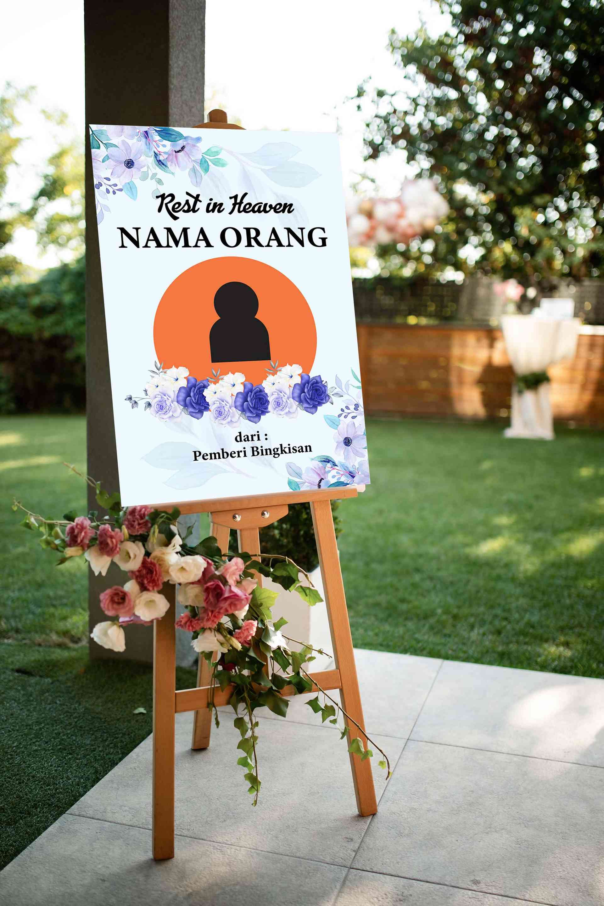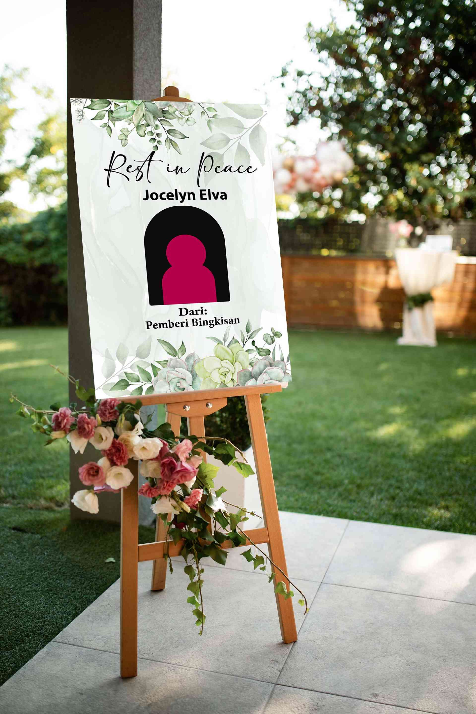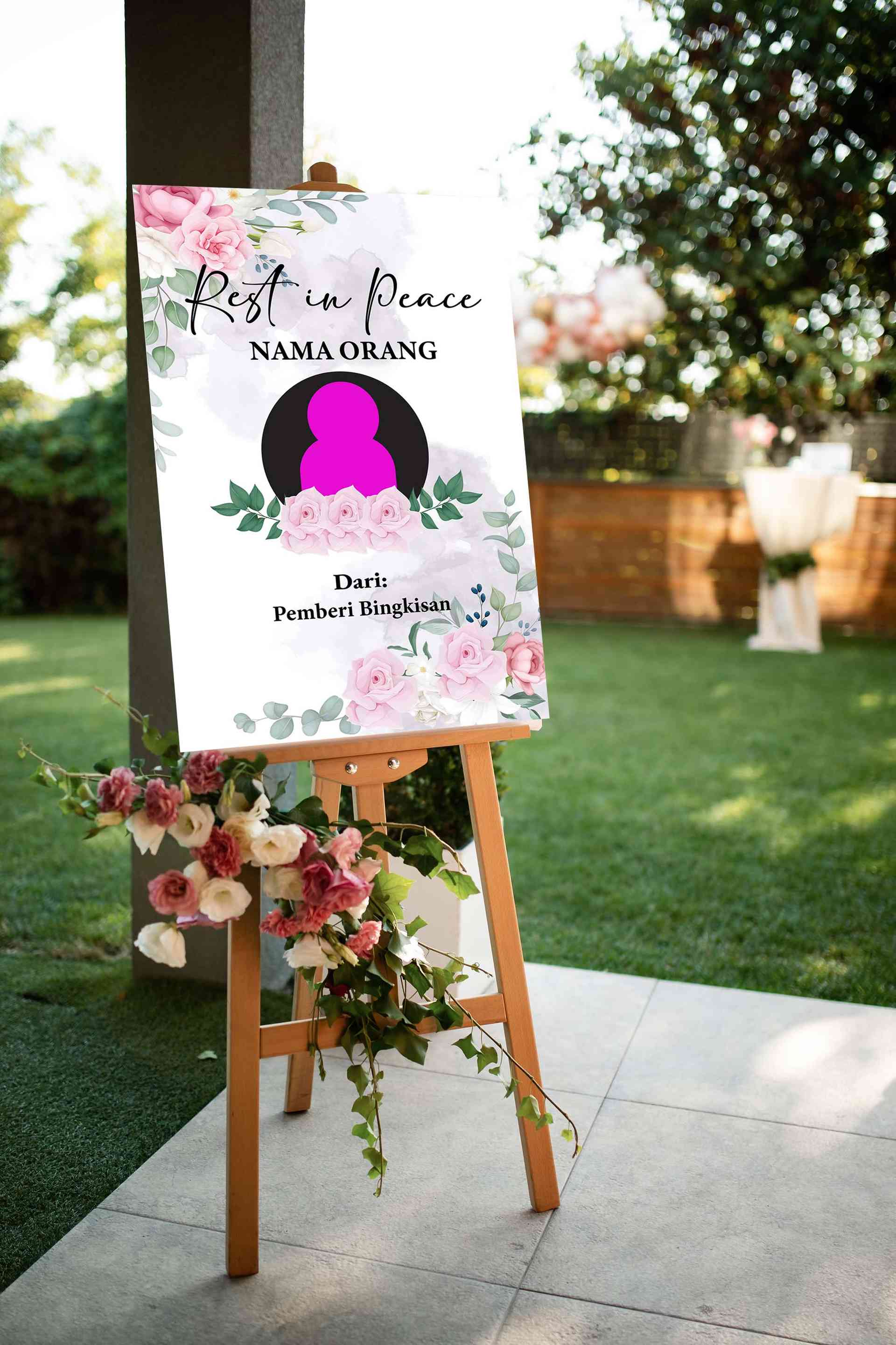 Acrylic Sign Tripod Kedukaan ini berbentuk persegi panjang vertikal dengan dominasi warna pastel, terutama pink dan hijau, serta dihiasi elemen floral seperti bunga mawar dan dedaunan di bagian atas dan bawah. Desain visual menonjolkan tipografi elegan bertuliskan "Rest in Peace" serta ruang kosong untuk nama almarhum dan pengirim, dilengkapi ilustrasi siluet dengan aksen floral romantis yang hangat. Produk ini berfungsi sebagai papan ucapan belasungkawa untuk memperingati kepergian seseorang, cocok untuk digunakan dalam acara pemakaman atau memorial, menyasar keluarga, kolega, atau kerabat sebagai target pasar yang ingin memberikan penghormatan terakhir dengan tampilan yang lembut dan penuh perhatian.