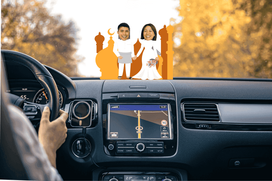 Akrilik goyang-goyang desain couple beragama Islam menikah berbentuk dua figur kartun pria dan wanita dengan wajah realistik, mengenakan busana pengan...