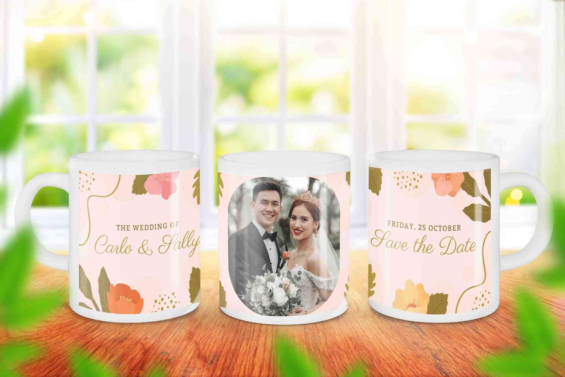 Mug souvenir pernikahan dengan desain floral klasik ini menampilkan bentuk silinder berwarna dasar putih, dihiasi motif bunga berwarna pastel seperti...