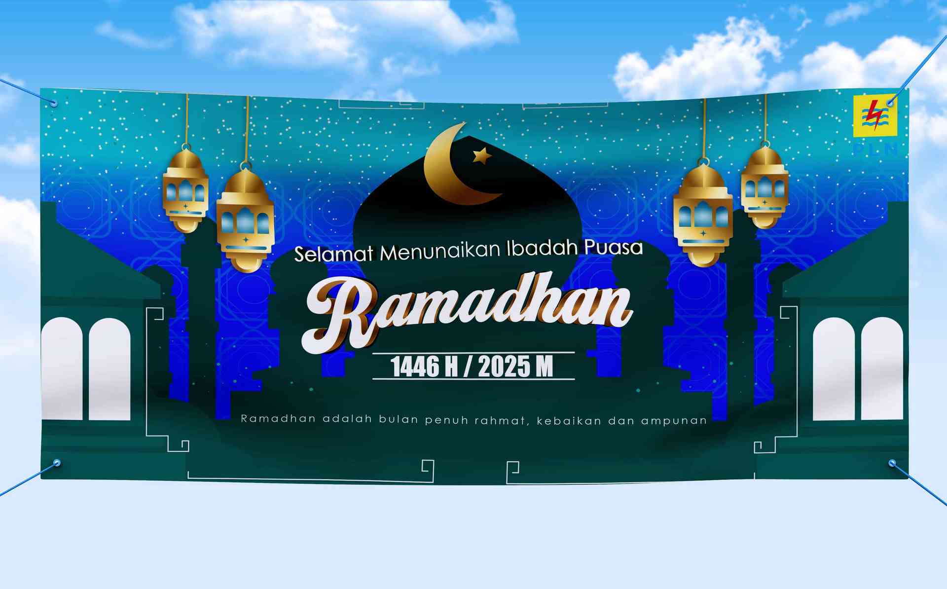 Gambar ini adalah desain mockup baliho atau banner dengan tema Ramadhan. Desainnya didominasi oleh warna biru tua dan hijau dengan elemen khas islami...