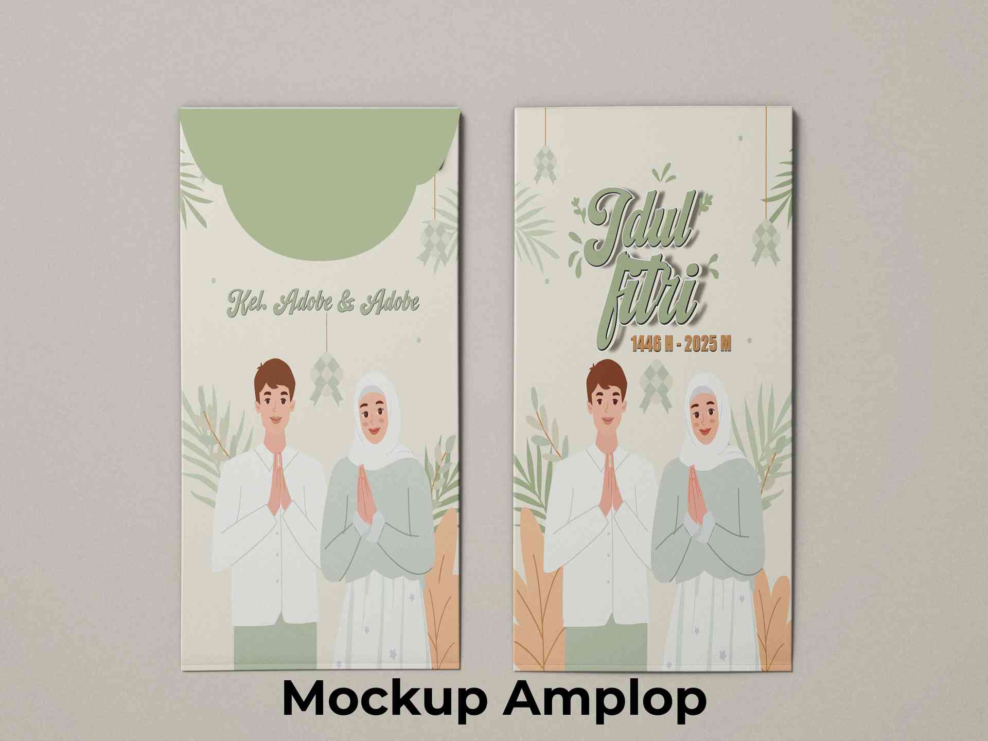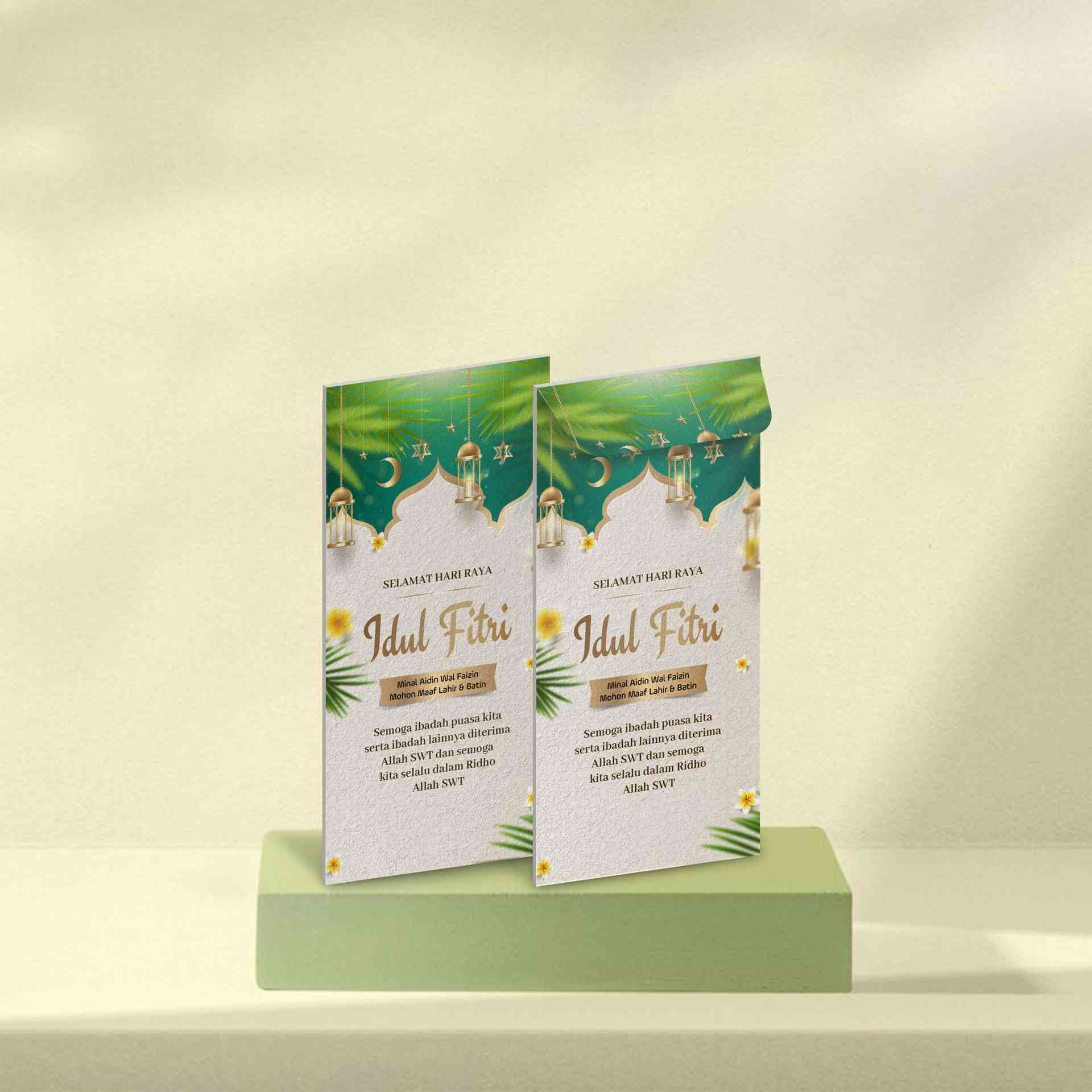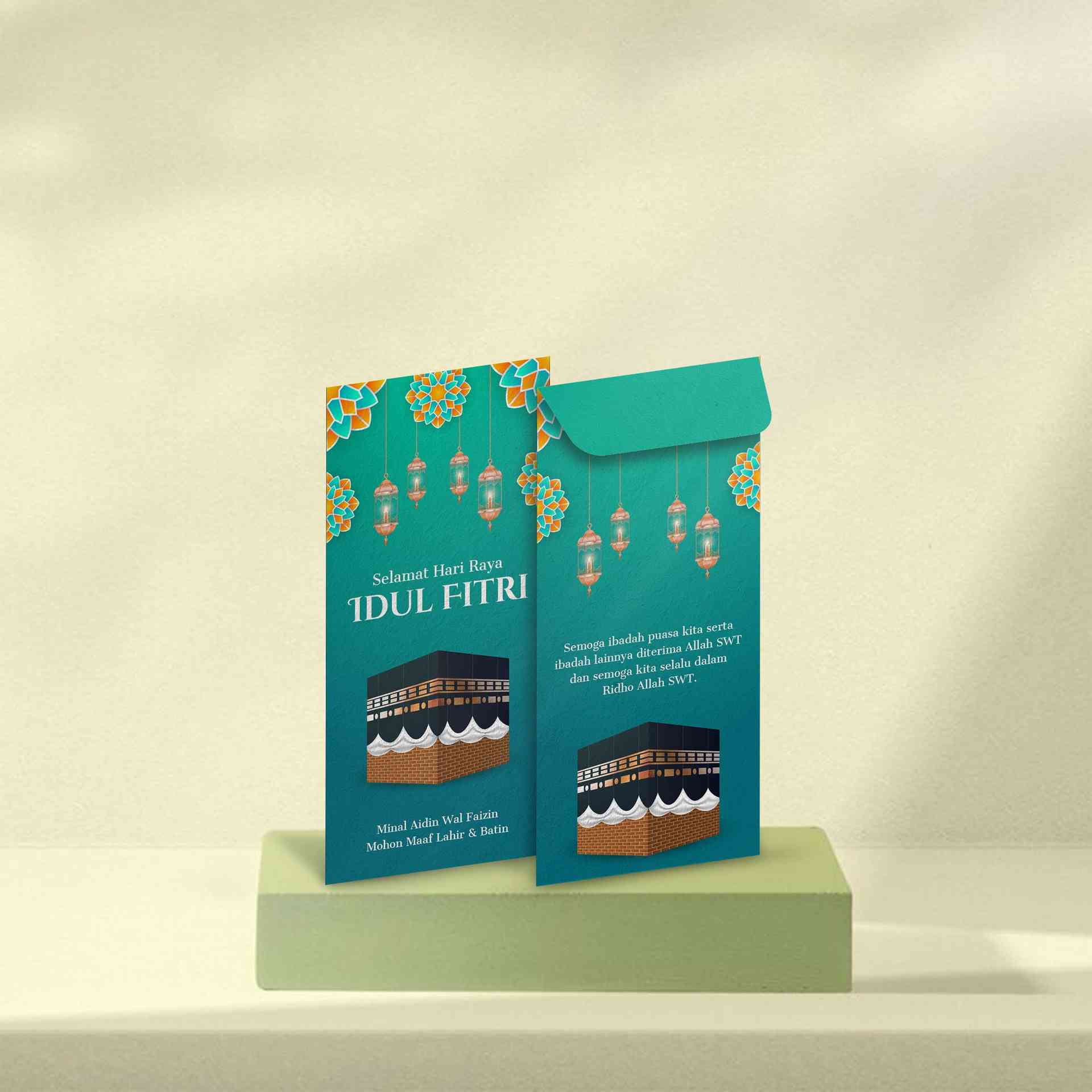 Amplop Lebaran di atas memiliki desain yang elegan dengan nuansa hijau yang segar dan ornamen Islami seperti lentera, bulan sabit🌙, bintang⭐, serta e...