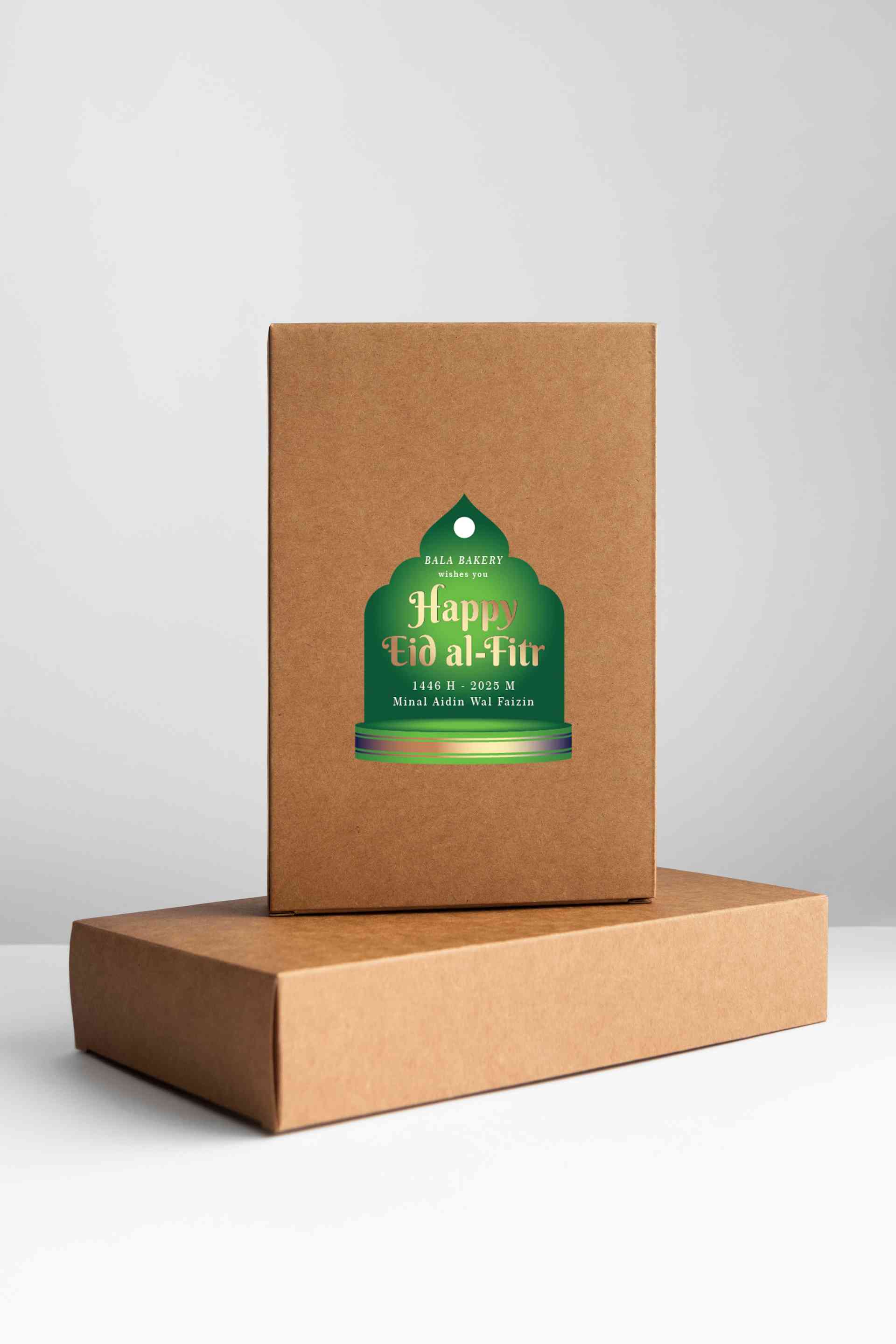 Stiker ini merupakan label bertema Idul Fitri yang ditempelkan pada kemasan kotak berbahan kraft coklat. Desainnya menggunakan elemen khas islami deng...