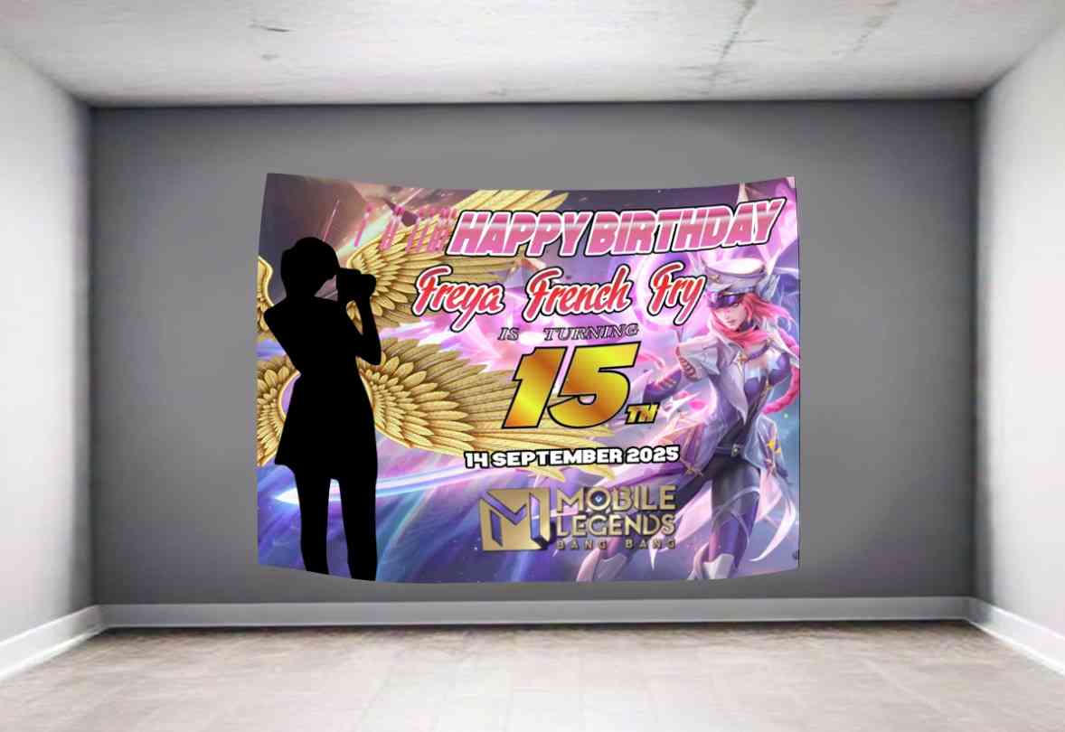 dengan tema Mobile Legends, menampilkan karakter Freya dalam desain futuristik dengan sayap emas. Teks utama bertuliskan "Happy Birthday" dengan nama...