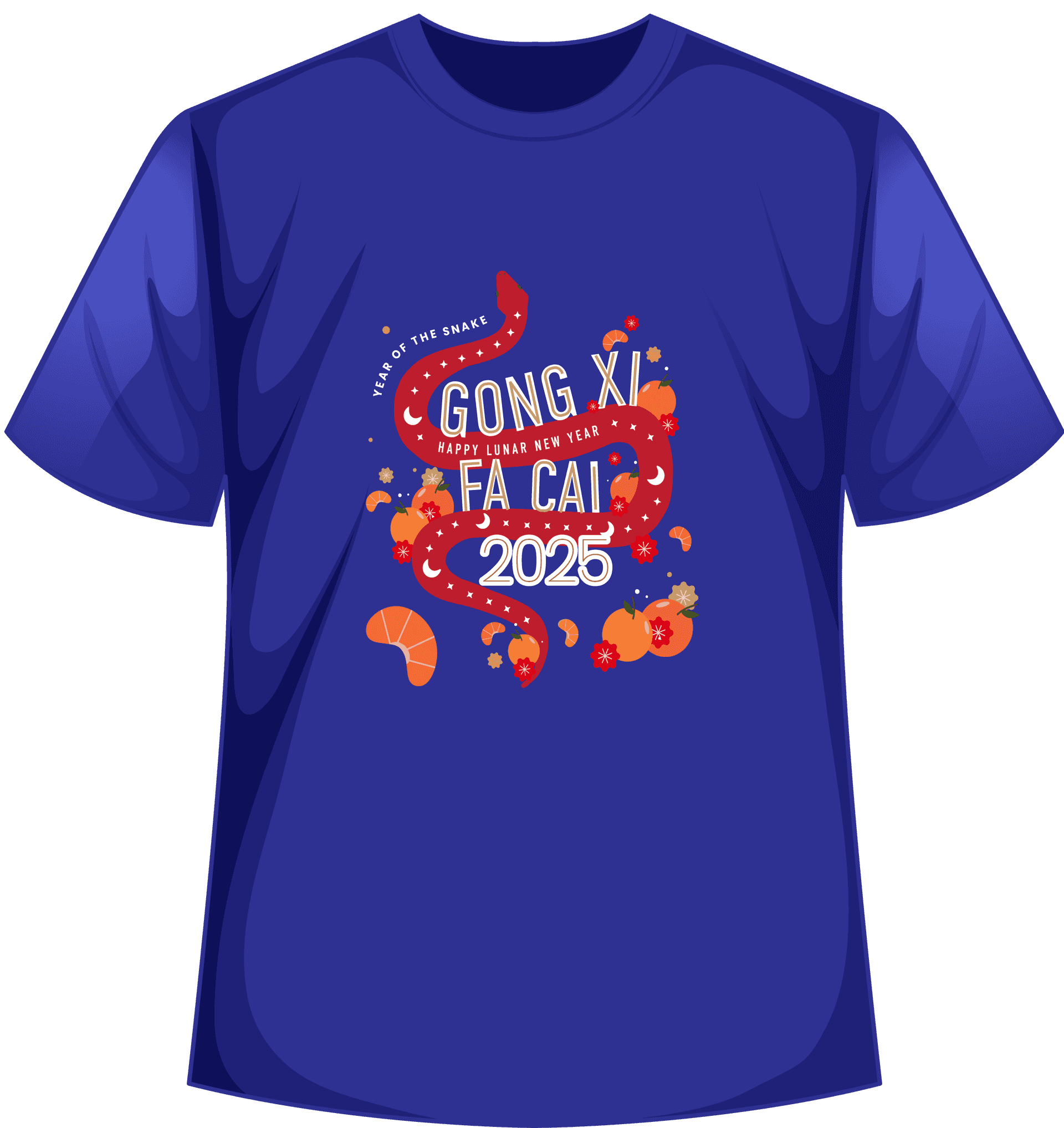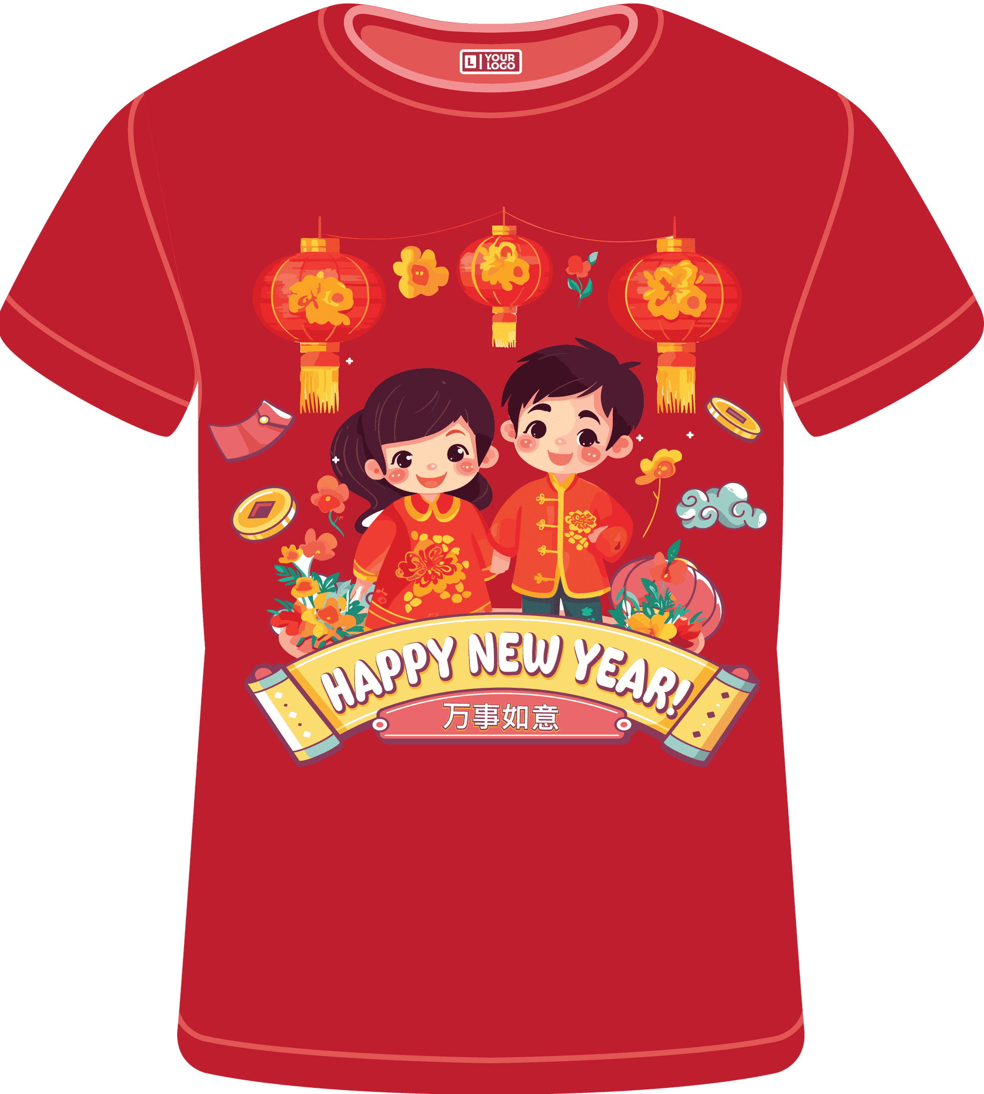 Desain baju kaos Imlek ini mengusung tema keberuntungan dan kemakmuran dengan ornamen bunga berwarna merah dan emas, sangat cocok untuk merayakan Tahun Baru Imlek dengan nuansa yang elegan dan penuh makna.