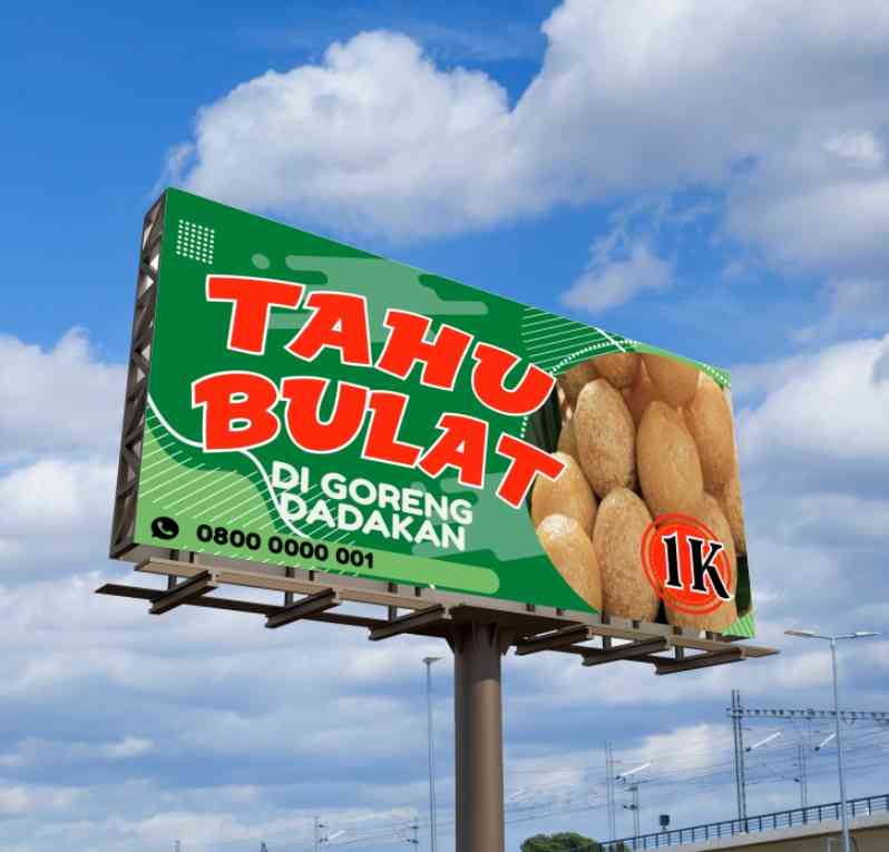 Desain baliho ini menggunakan perpaduan warna kuning cerah dan merah marun,memberi kesan hangat,ceria,dan menggugah selera. Judul besar “TAHU BULAT” t...