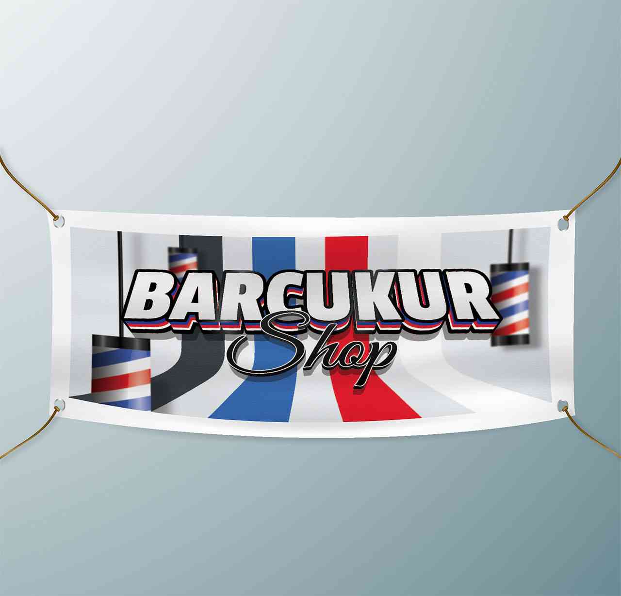 Baliho ini mempromosikan Barcukur Shop, tempat pangkas rambut yang profesional dengan desain yang stylish. Gambar menampilkan palet warna merah, putih...
