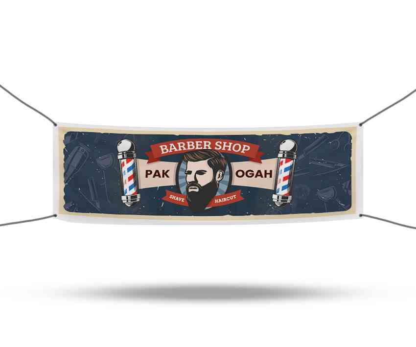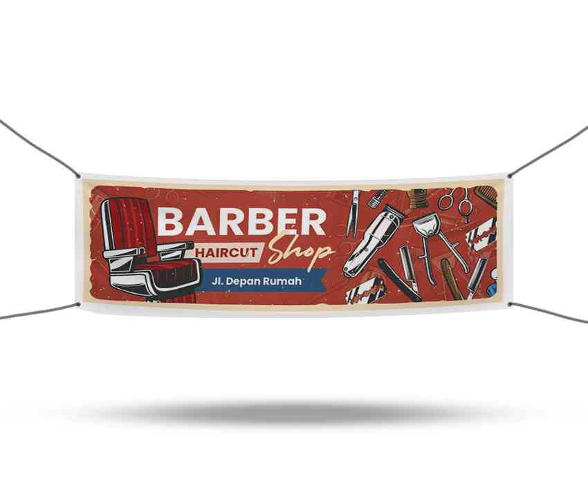 Baliho ini mempromosikan sebuah barbershop yang menawarkan layanan cukur profesional dengan berbagai alat cukur lengkap. Gambar menampilkan alat cukur...