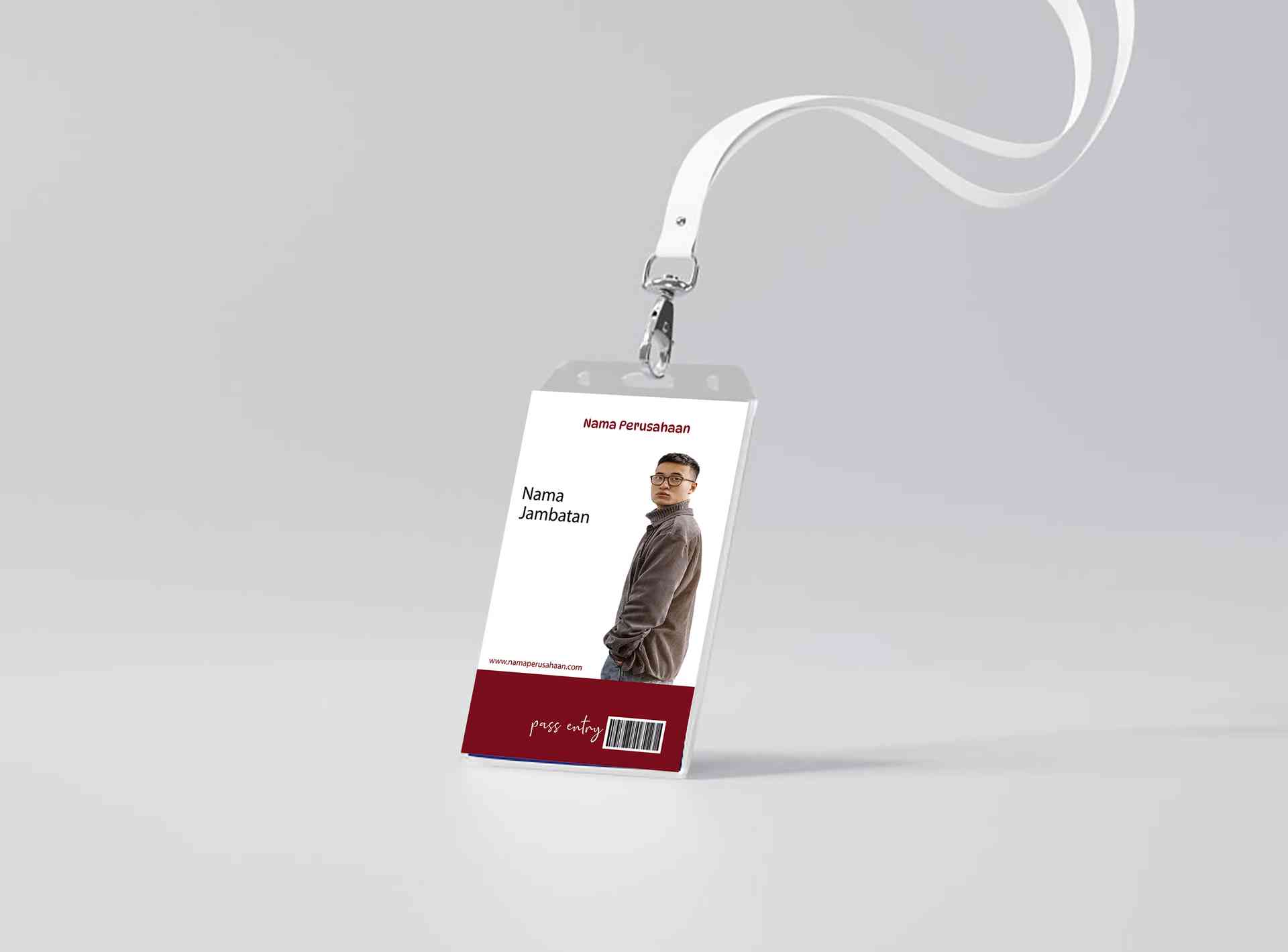 ID Card formal beraksen maroon dengan desain minimalis, didominasi latar putih serta blok warna maroon di bagian bawah yang menampilkan barcode dan te...