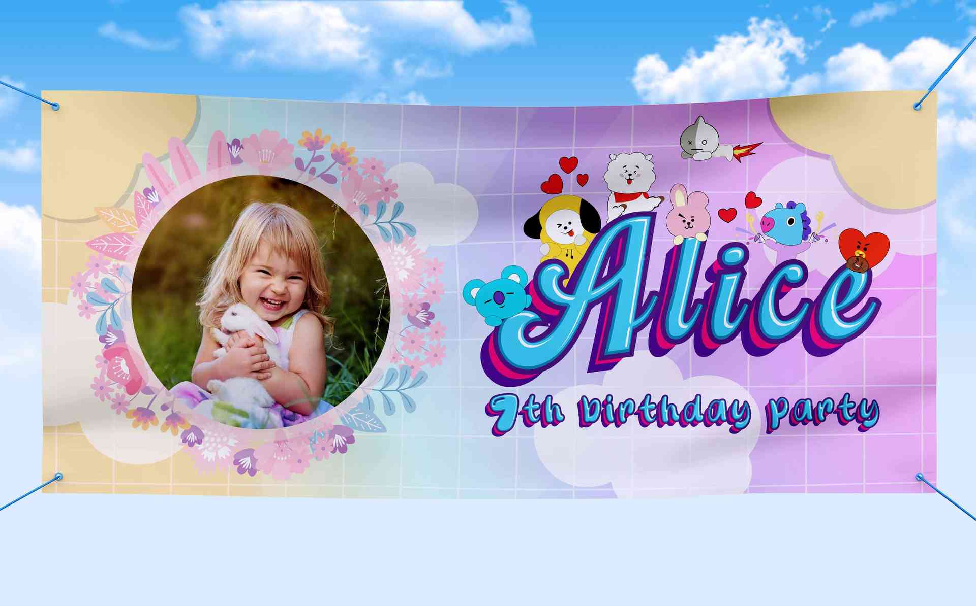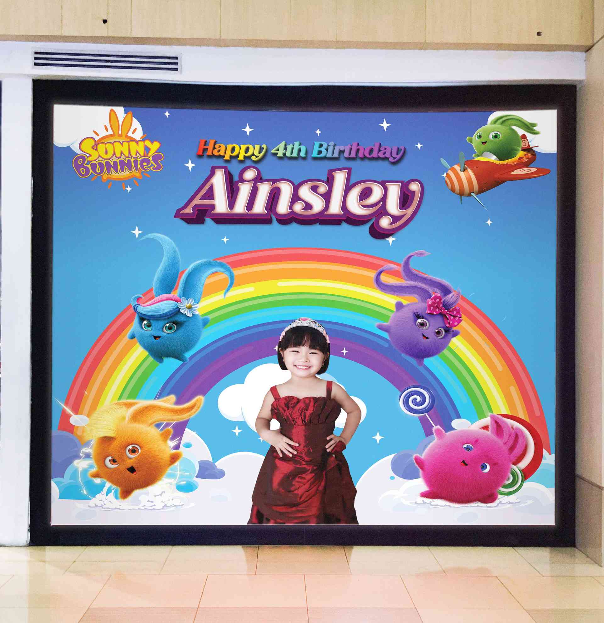 Desain backdrop ini menampilkan tema ulang tahun anak yang ceria dengan karakter Sunny Bunnies sebagai elemen utama. Latar belakang berwarna biru lang...