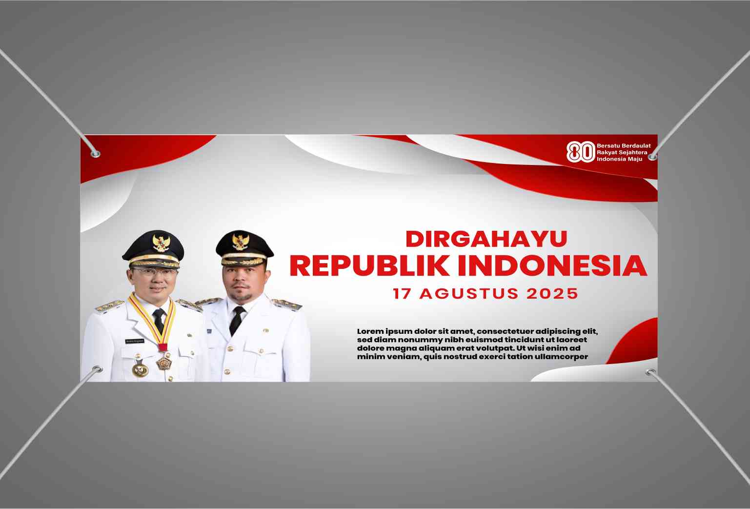Spanduk perayaan HUT ke-80 Republik Indonesia ini berbentuk persegi panjang horizontal dengan warna dominan merah dan putih, menonjolkan nuansa nasionalisme. Elemen visual utama berupa dua sosok berpakaian dinas resmi berlatarkan gradasi merah-putih, menegaskan tema kenegaraan. Judul “Bersatu dan Berdaulat: Indonesia 80 Tahun Tetap Jaya” serta ucapan selamat HUT RI 17 Agustus 2025 ditulis jelas menggunakan tipografi tegas dengan aksen merah mencolok. Produk ini berfungsi sebagai media promosi dan ucapan institusi bisnis atau pemerintahan dalam konteks perayaan nasional, menargetkan perusahaan, instansi, dan masyarakat umum.