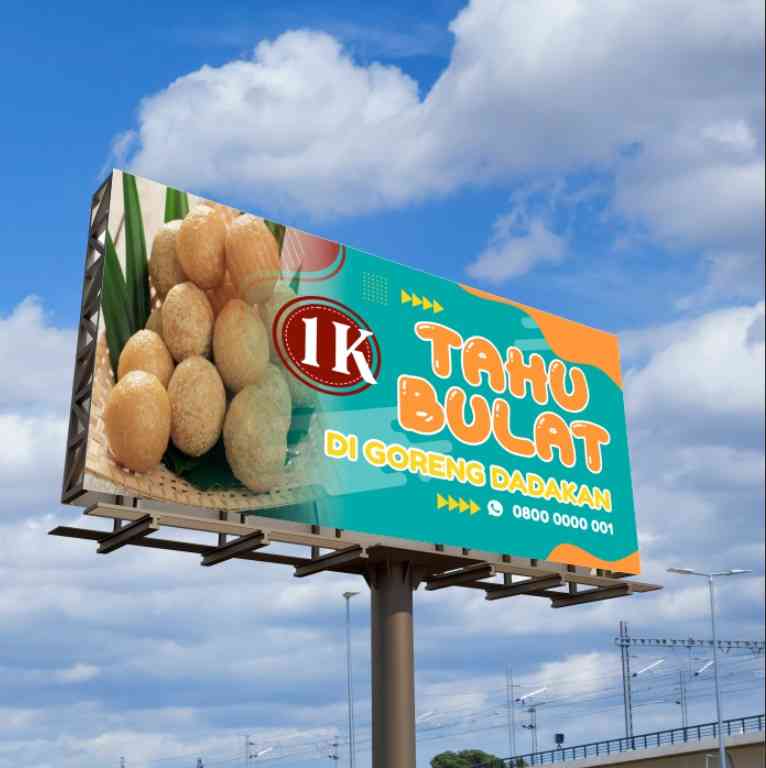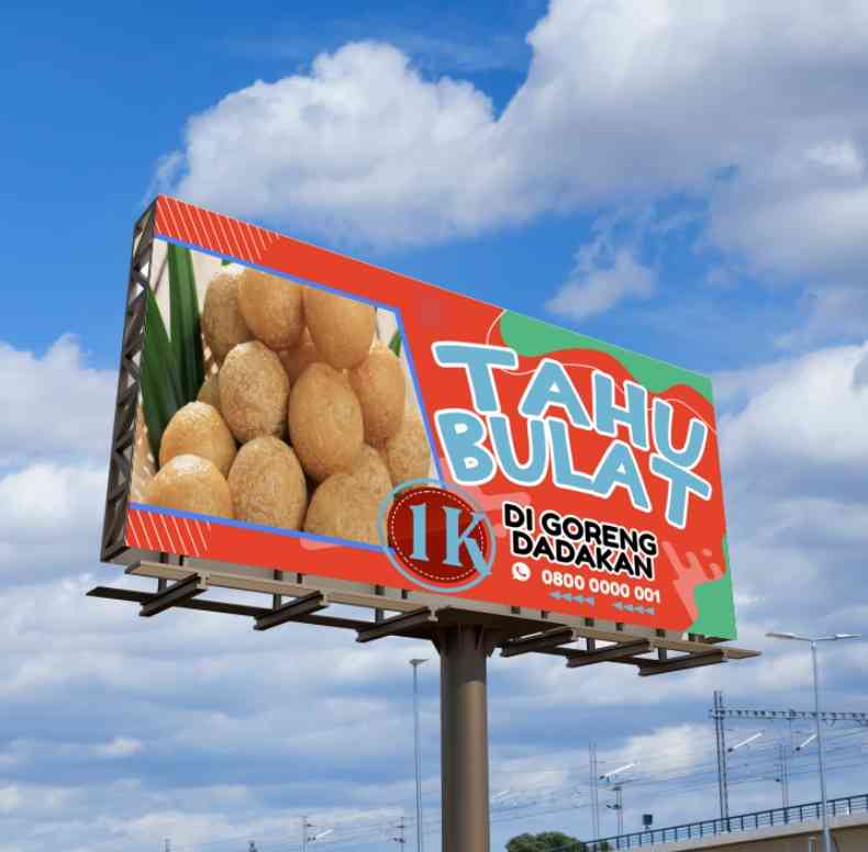 Desain baliho ini menggunakan perpaduan warna kuning cerah dan merah marun,memberi kesan hangat,ceria,dan menggugah selera. Judul besar “TAHU BULAT” t...