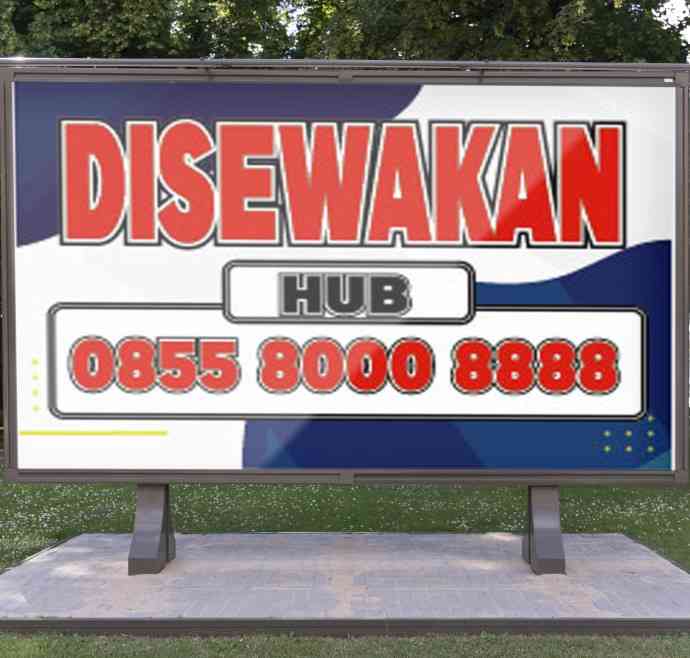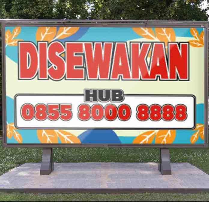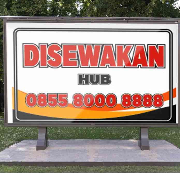 Papan reklame ini dirancang dengan gaya tegas dan langsung, menampilkan kata "DISEWAKAN" dalam huruf kapital besar berwarna merah menyala dengan outline putih dan hitam, untuk menarik perhatian dari kejauhan. Di bawahnya, terdapat kata "HUB" berwarna hitam pekat yang memperkuat ajakan untuk menghubungi. Nomor telepon 0855 8000 8888 tercetak besar dengan gradasi merah ke oranye dan efek outline yang mempertegas visibilitasnya. Latar bawah belakang menambahkan kesan untuk memperkuat daya tarik visual papan ini.