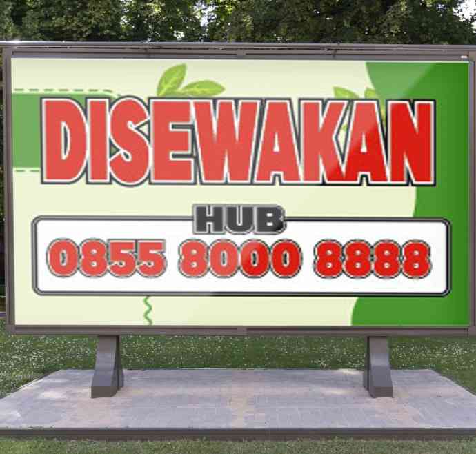 Papan reklame ini dirancang dengan gaya tegas dan langsung, menampilkan kata "DISEWAKAN" dalam huruf kapital besar berwarna merah menyala dengan outline putih dan hitam, untuk menarik perhatian dari kejauhan. Di bawahnya, terdapat kata "HUB" berwarna hitam pekat yang memperkuat ajakan untuk menghubungi. Nomor telepon 0855 8000 8888 tercetak besar dengan gradasi merah ke oranye dan efek outline yang mempertegas visibilitasnya. Latar bawah belakang menambahkan kesan untuk memperkuat daya tarik visual papan ini.