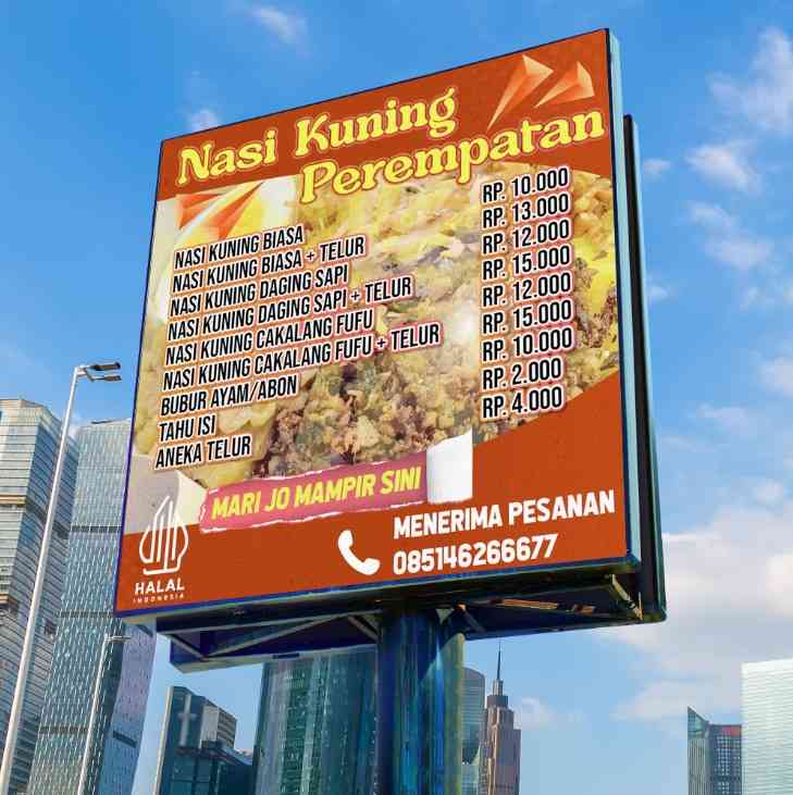 Baliho ini merupakan media promosi dari warung "Nasi Kuning Perempatan" yang menyajikan berbagai pilihan menu nasi kuning khas dengan harga terjangkau...