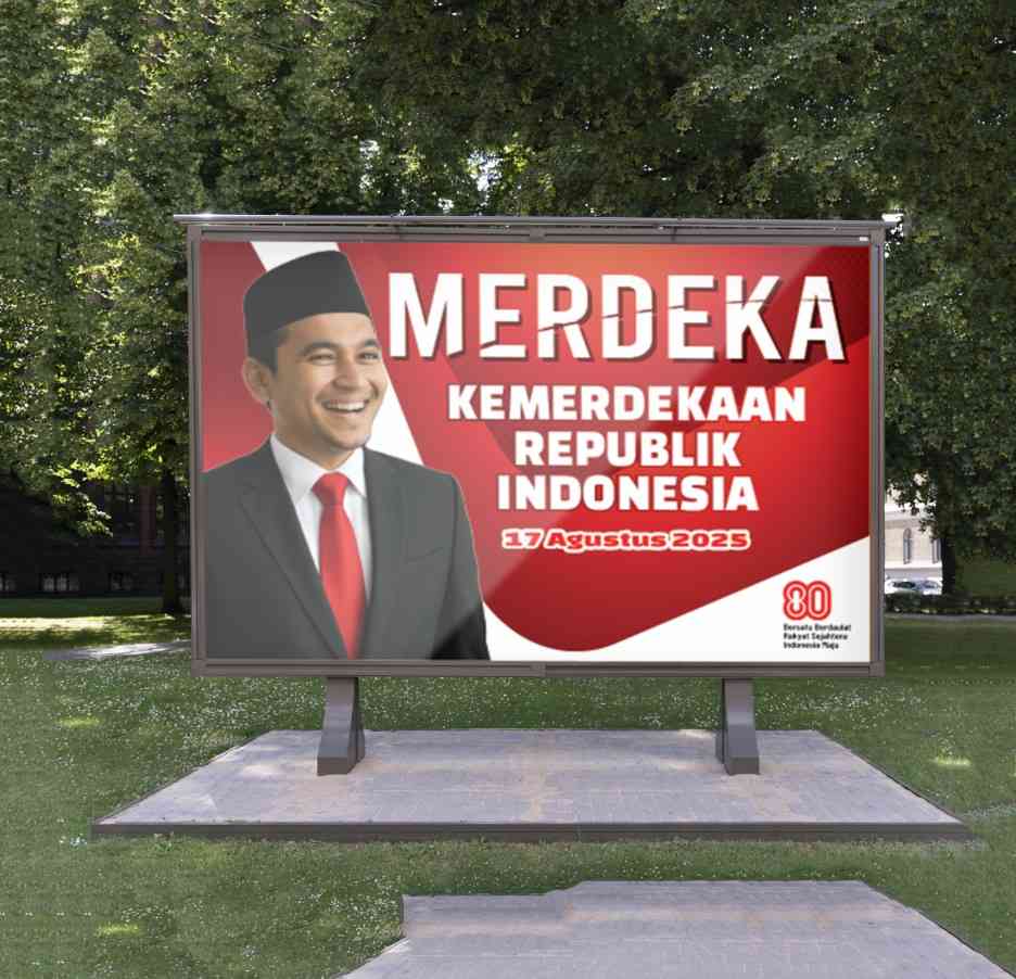 Baliho berukuran besar ini menonjolkan perayaan HUT RI ke-80 dengan tema “Fun Run 2025”, didominasi warna merah dan putih yang merepresentasikan seman...