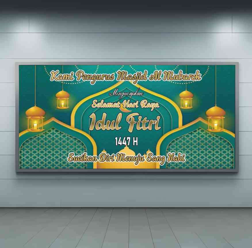 Banner ucapan Idul Fitri ini tampil cerah dengan dominasi warna hijau toska yang menenangkan berpadu indah dengan aksen kuning keemasan, menghadirkan...
