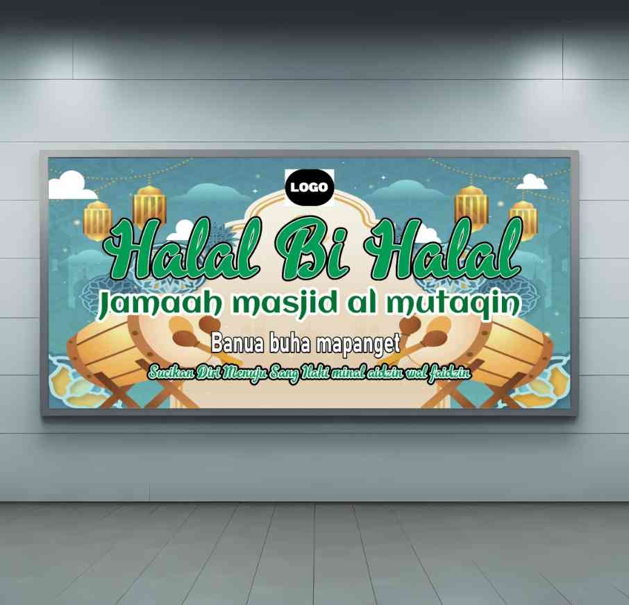 Tipografi tulisan "Halal Bi Halal" menggunakan huruf kaligrafi modern dengan warna emas yang mencolok, memberikan kesan penuh hormat namun tetap bersahabat bagi setiap jamaah yang membaca pesan pada baliho ini. Kalimat ucapan selamat yang disusun secara rapi menguatkan pesan silaturahmi, membawa perasaan nyaman dan kehangatan bagi siapapun yang melihat.