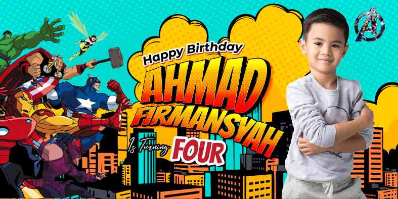 Di tengah langit biru yang cerah, berdirilah baliho megah yang menggambarkan pesta ulang tahun yang tak terlupakan. Langit dipenuhi dengan gambar-gambar para pahlawan super favorit: Iron Man, Captain America, Thor, Hulk, dan Black Widow, semuanya berkumpul dalam kekuatan mereka yang epik.