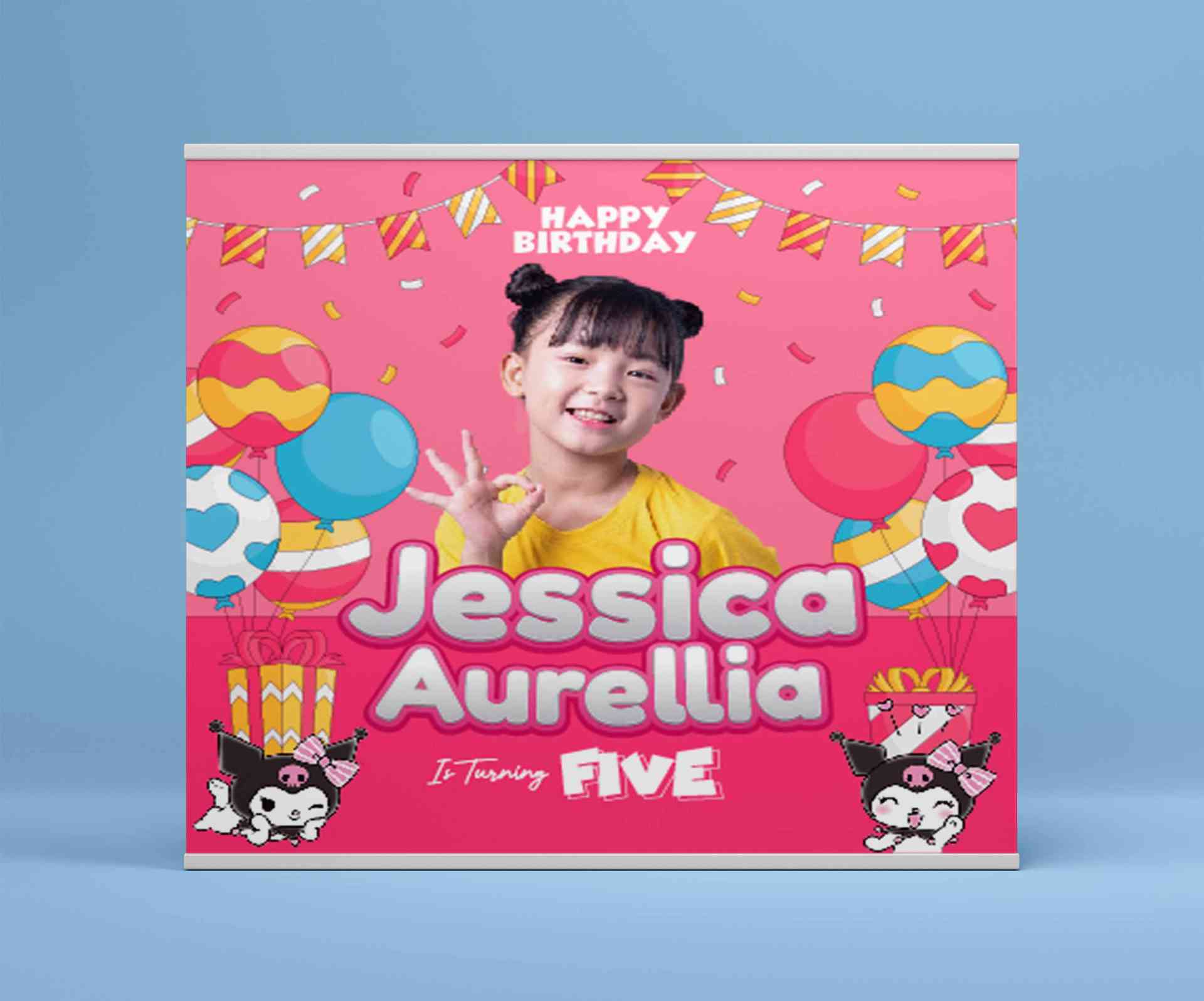 Selamat datang di perayaan ulang tahun kami yang spesial! Bergabunglah dalam perayaan yang penuh warna dan keceriaan dengan tema Kuromi, karakter ikonik yang lucu dan menggemaskan. Baliho ini menghiasi suasana dengan desain yang ceria dan menarik, memadukan nuansa hitam, pink, dan putih dengan sentuhan gaya punk yang khas Kuromi.