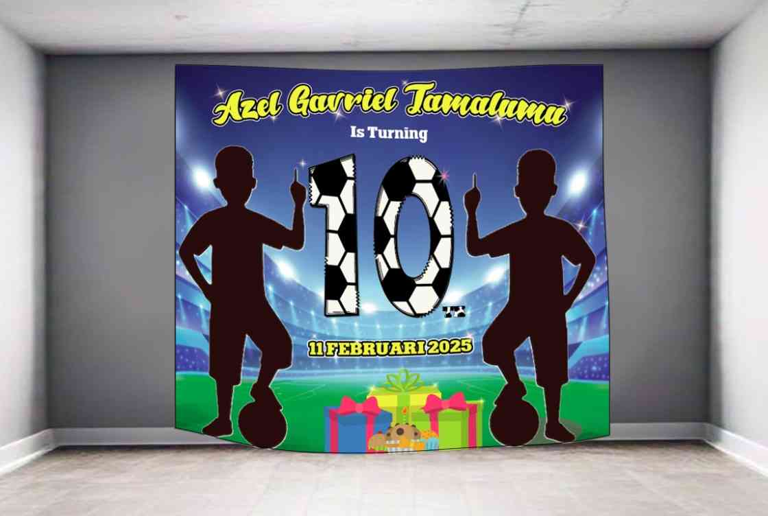 Ulang tahun bertema sepak bola untuk anak yang merayakan ulang tahunnya ke-10 pada tanggal 11 Februari 2025. Poster ini menampilkan angka "10" dengan...