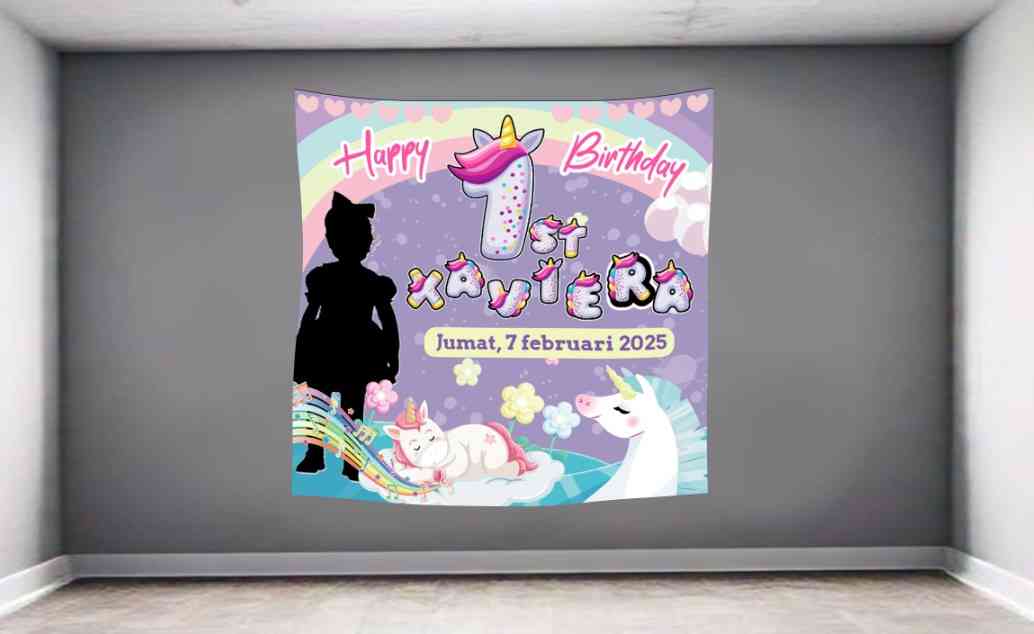 Baliho ulang tahun ini dirancang untuk merayakan ulang tahun pertama anak dengan tema unicorn yang ceria dan penuh warna. Dengan latar belakang ungu y...