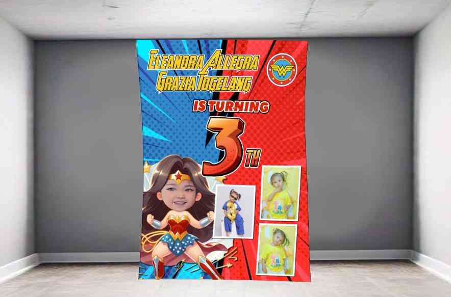 Baliho ulang tahun ini dibuat dengan tema Wonder Woman untuk merayakan ulang tahun ke-3 seorang anak bernama Eleanora Allegra Grazia Togelang. Desainn...
