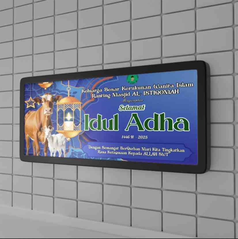 Desain baliho ini dibuat dengan komposisi warna dominan biru toska dan emas, menciptakan kesan yang modern sekaligus Islami. Berlatar elemen lentera dan pola geometris khas Timur Tengah berbingkai emas, baliho ini cocok digunakan untuk perayaan Idul Adha 1446 H / 2025 M di lingkungan masjid, kampus, sekolah, atau komunitas Muslim.