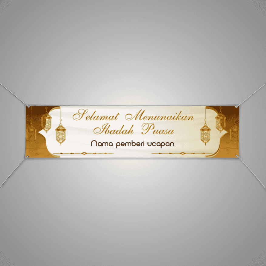 Spanduk "Selamat Menunaikan Ibadah Puasa" ini memiliki desain elegan dengan dominasi warna emas dan putih, menciptakan kesan mewah dan sakral yang coc...