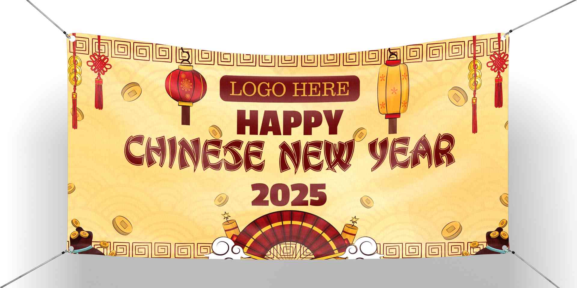Di bagian tengah baliho, terdapat ucapan selamat Tahun Baru Imlek dengan kaligrafi elegan berwarna emas, seperti "Gong Xi Fa Cai" atau "Selamat Tahun Baru Imlek". Tulisan ini dikelilingi oleh ornamen-ornamen khas seperti lentera merah, kipas tradisional, dan koin emas Cina.