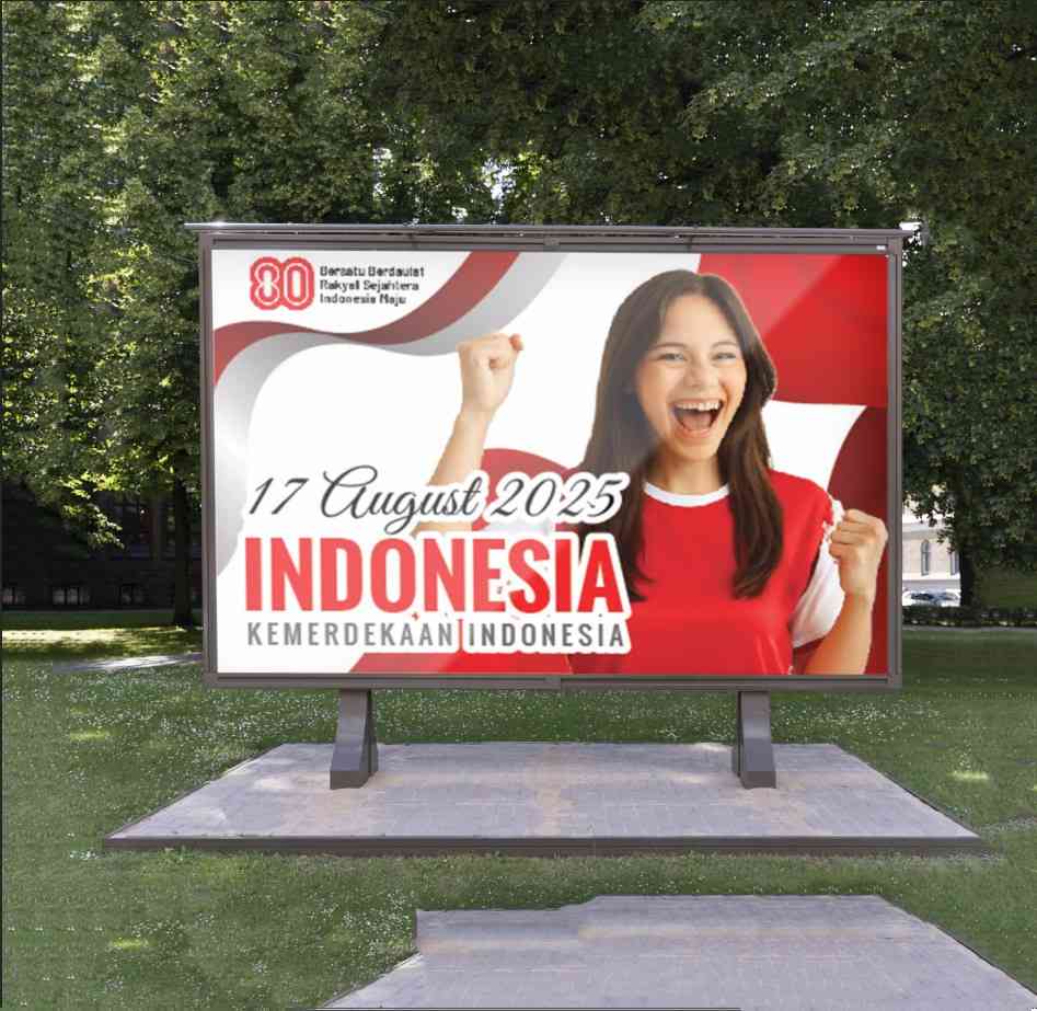 Baliho kemerdekaan ini berbentuk persegi panjang horizontal dengan tema visual nasionalisme yang kuat, didominasi warna merah dan putih yang mereprese...