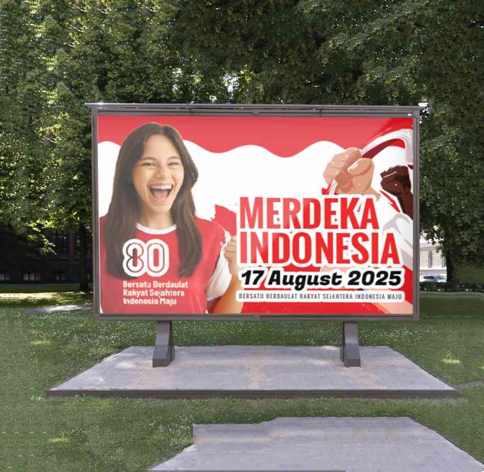 Baliho Kemerdekaan Indonesia 17 Agustus menampilkan desain vertikal dengan warna dominan merah dan putih, menggambarkan semangat Hari Kemerdekaan. Elemen visual utama berupa ilustrasi sosok muda yang ekspresif dan bersemangat, dipadukan dengan tipografi besar bertuliskan “80 Bersatu Berdaulat Rakyat Sejahtera Indonesia Maju,” serta tanggal “17 August 2025 INDONESIA KEMERDEKAAN INDONESIA.” Tema visual kuat pada nasionalisme dan perayaan, sangat cocok untuk digunakan oleh institusi pemerintah, organisasi masyarakat, atau pelaku usaha yang ingin menghidupkan suasana kemerdekaan dan menarik perhatian publik luas di ruang terbuka.