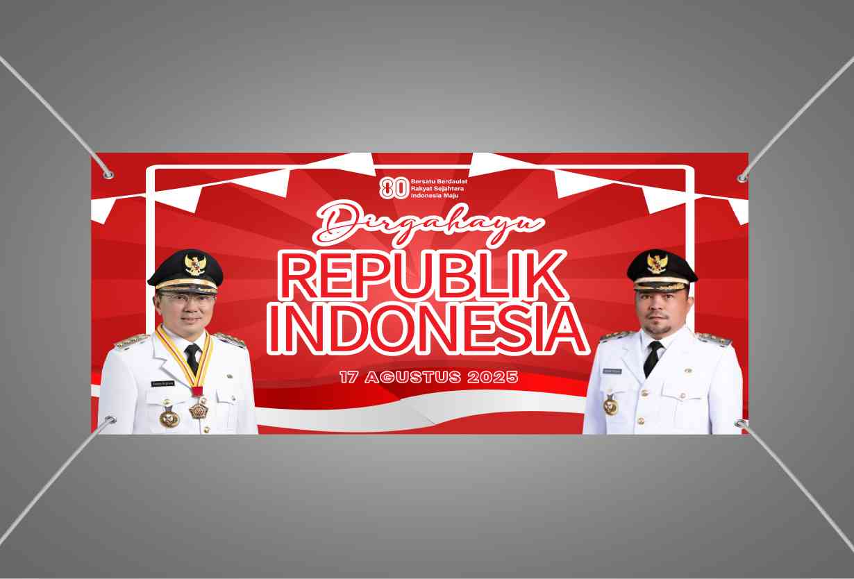 Baliho kemerdekaan ini berbentuk persegi panjang horizontal dengan latar merah gelap bertekstur, dihiasi elemen visual ombak bendera merah putih yang mencolok di bagian bawah. Di bagian tengah terdapat tulisan besar “Dirgahayu Republik Indonesia 17 Agustus 2025” dengan font tebal dan jelas, didampingi ilustrasi dua sosok pejabat mengenakan seragam putih resmi. Desainnya bernuansa formal dan patriotik, cocok digunakan untuk perayaan HUT RI ke-80 di lingkungan pemerintahan, instansi, atau ruang publik yang menargetkan masyarakat umum sebagai audiens utama.