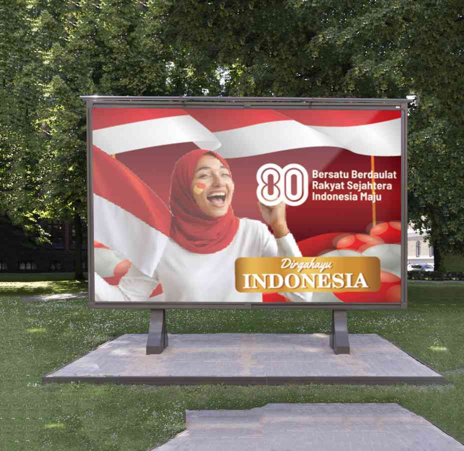 Baliho Kemerdekaan dengan Kebanggaan Indonesia Maju berbentuk persegi panjang horizontal dengan dominasi warna merah dan putih, menonjolkan desain vis...