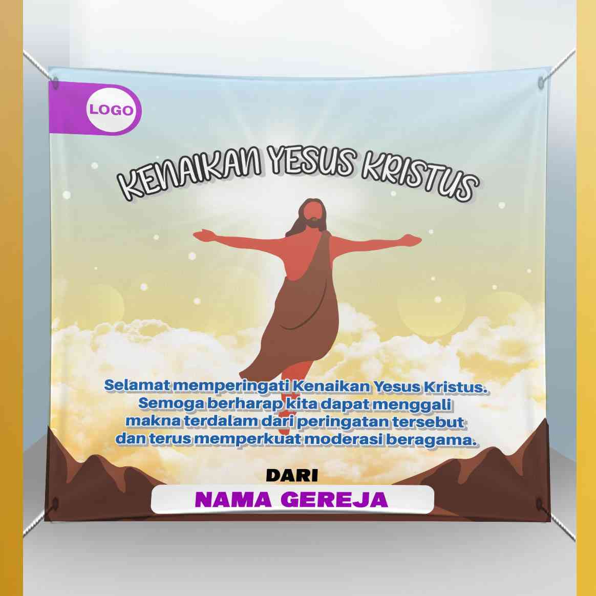 Deskripsi: Banner ini dirancang untuk memperingati Hari Kenaikan Yesus Kristus. Gambar ilustrasi Yesus yang naik ke surga dikelilingi langit biru dan...