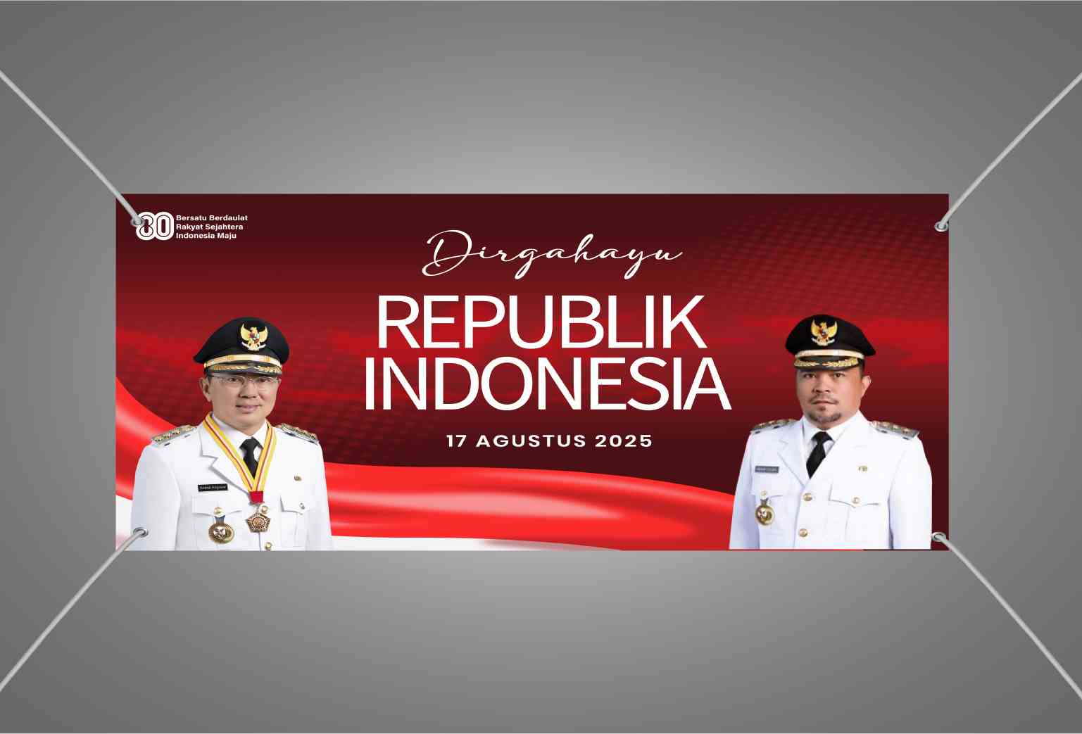 Spanduk perayaan kemerdekaan Indonesia bertema “Kita Adalah Indonesia: Rayakan 80 Tahun Kemerdekaan” menampilkan desain berbentuk persegi panjang horizontal dengan karakter visual utama dua pejabat pemerintah berpakaian seragam putih, dilengkapi atribut resmi. Warna dominan merah dan putih merefleksikan warna bendera nasional, dengan elemen pita merah-putih yang melengkung di bagian atas dan bawah sebagai aksen dinamis. Judul dan pesan bertuliskan “Dirgahayu Republik Indonesia 17 Agustus 2025” menggunakan font tebal berwarna merah, menciptakan kesan patriotik dan resmi. Spanduk ini ideal untuk instansi pemerintahan, ruang publik, atau komunitas yang merayakan Hari Kemerdekaan, serta menargetkan masyarakat umum sebagai audiens.