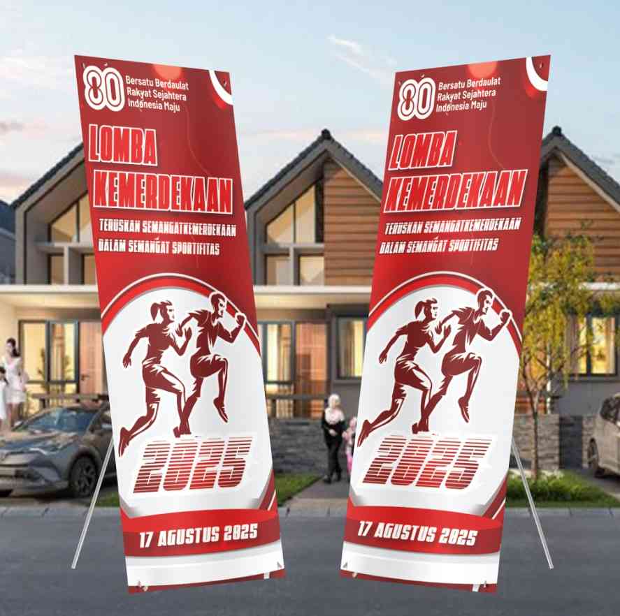 Banner lomba kemerdekaan berupa banner vertikal dengan bentuk persegi panjang tegak, didominasi warna merah dan putih yang mencerminkan nuansa nasiona...