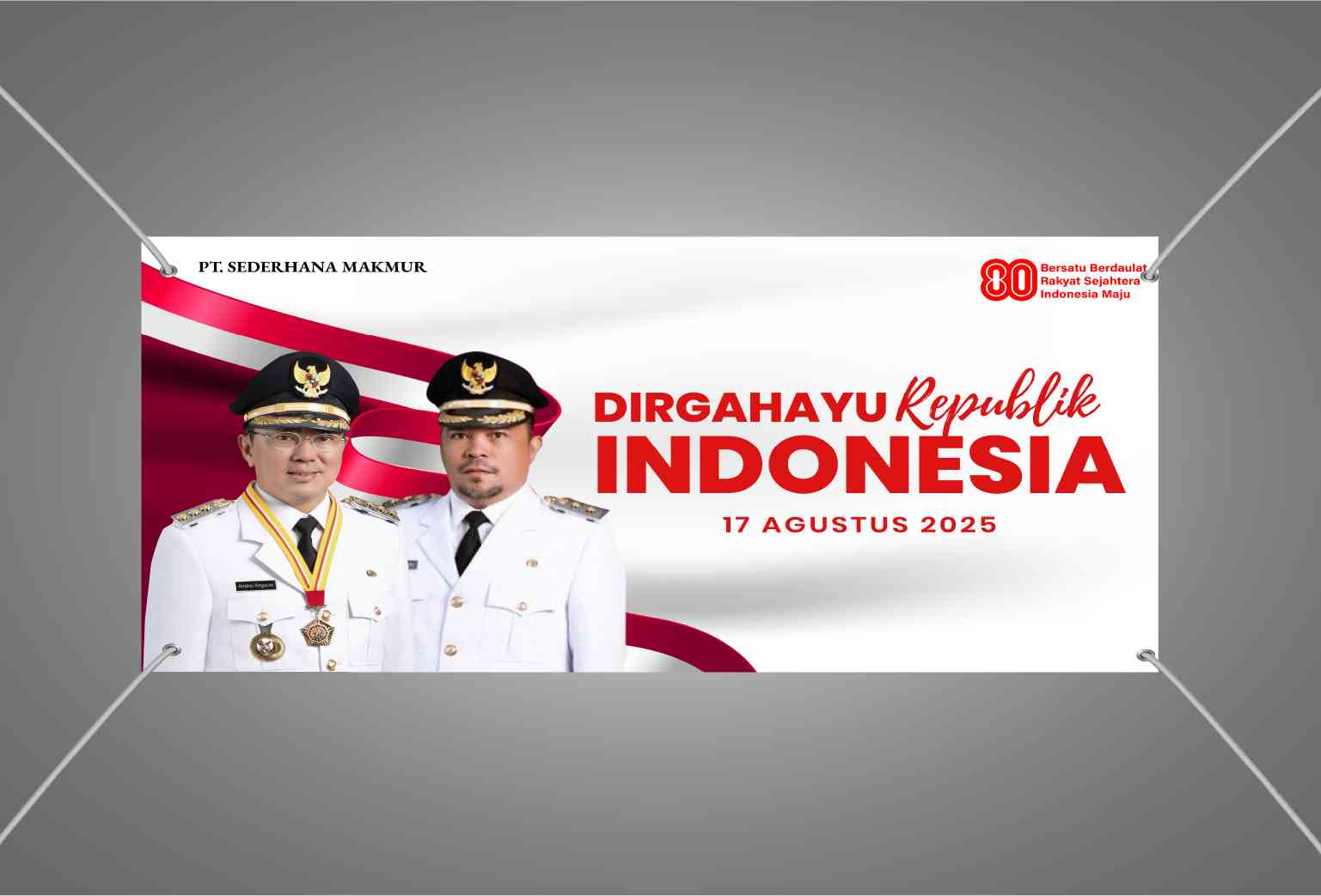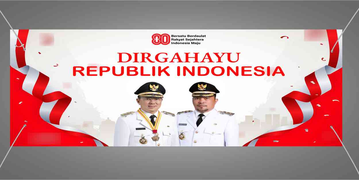Spanduk peringatan Hari Kemerdekaan Republik Indonesia ke-80 ini menampilkan desain horizontal dengan dominasi warna merah dan putih, mencerminkan tem...