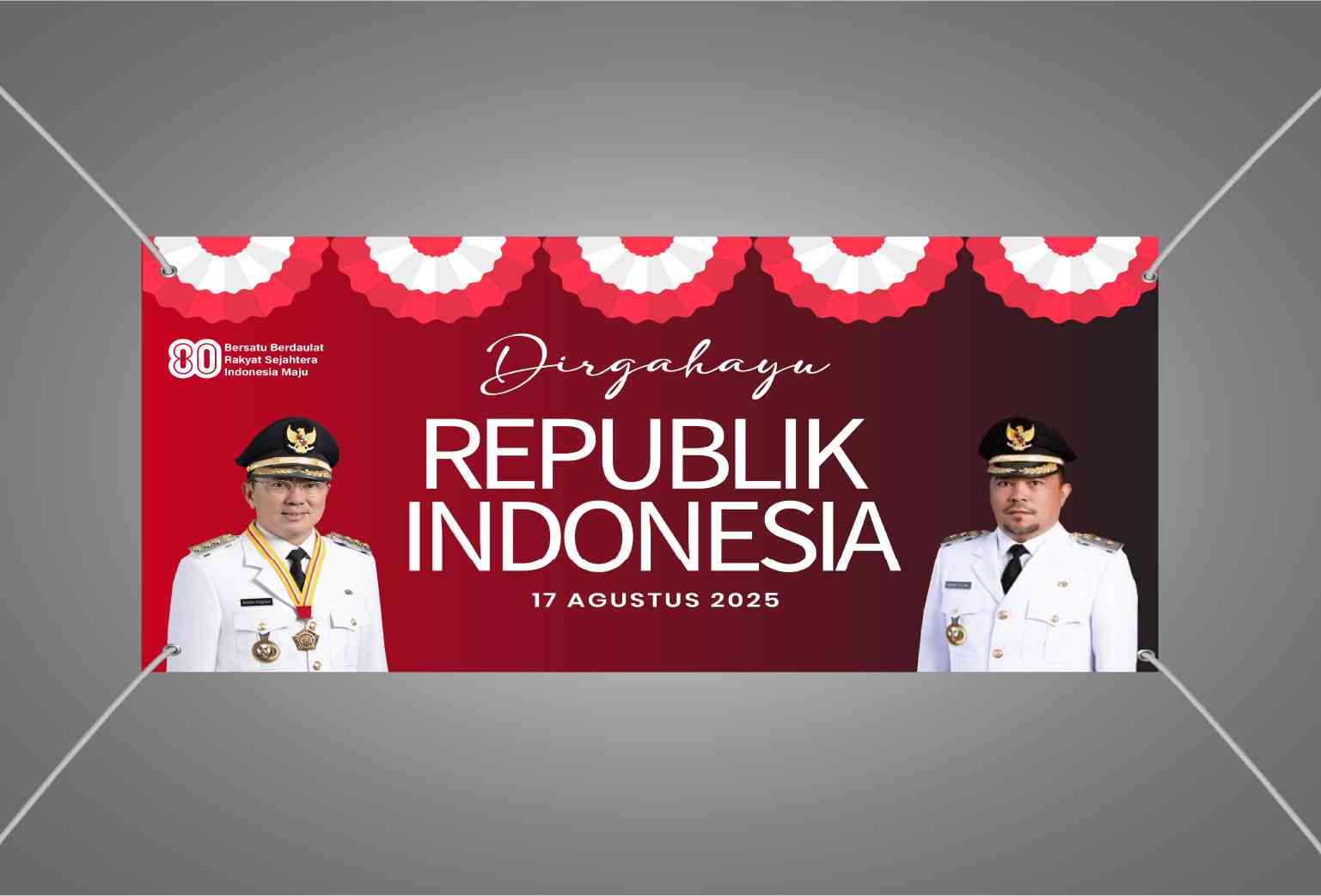 Spanduk peringatan Hari Kemerdekaan Republik Indonesia menampilkan dominasi warna merah dan putih dengan ilustrasi dua tokoh pejabat pemerintah berpak...