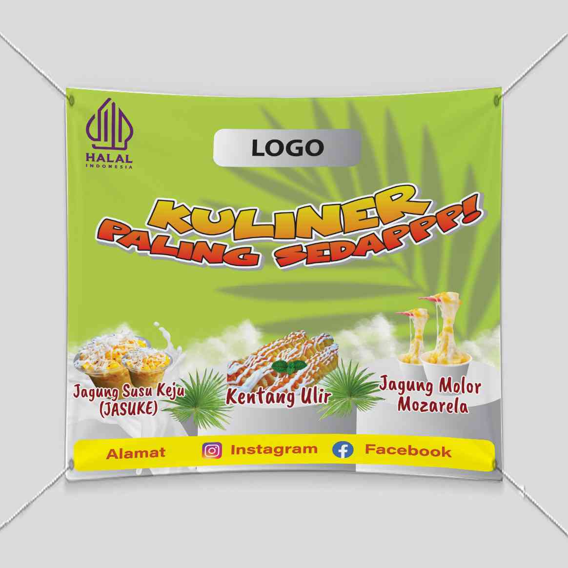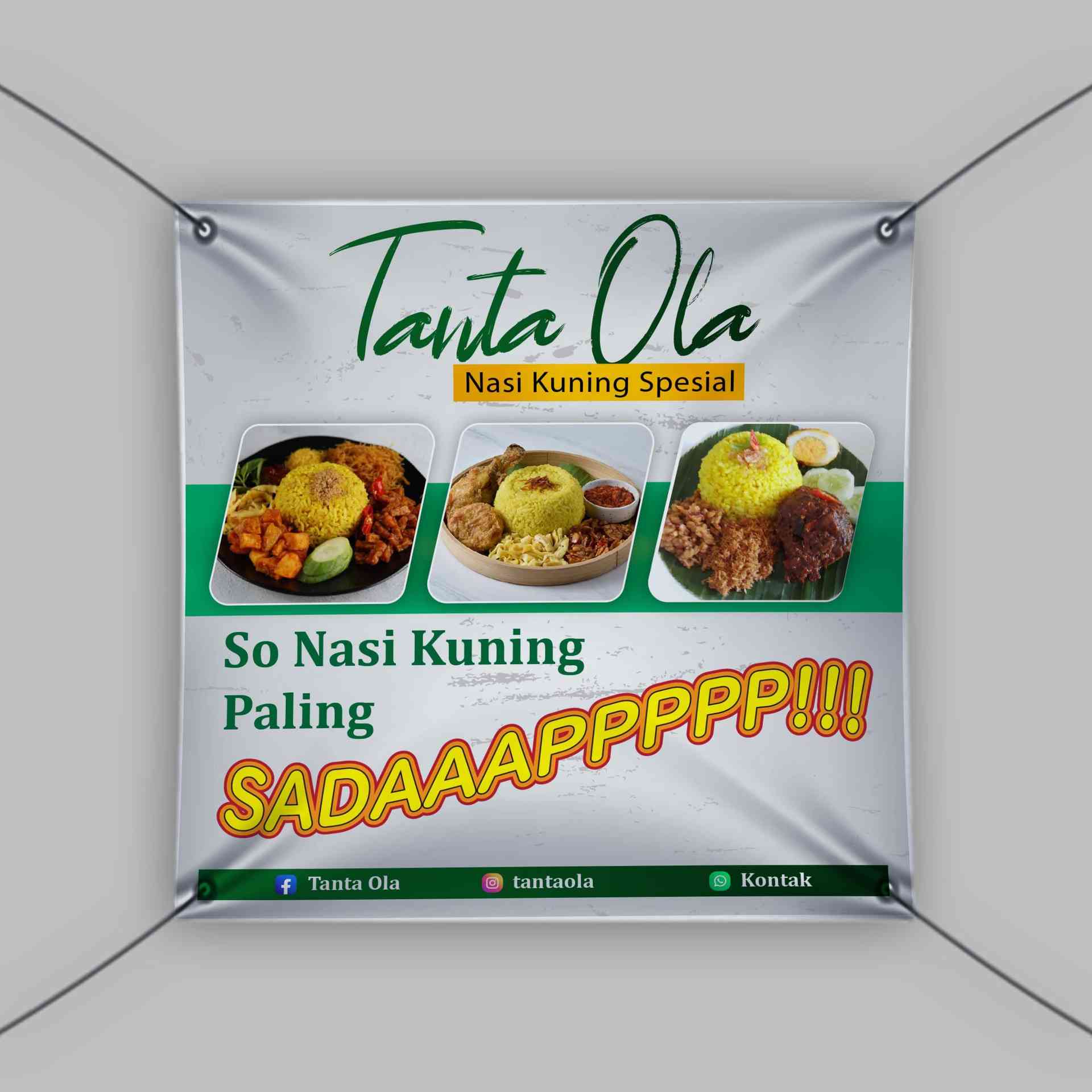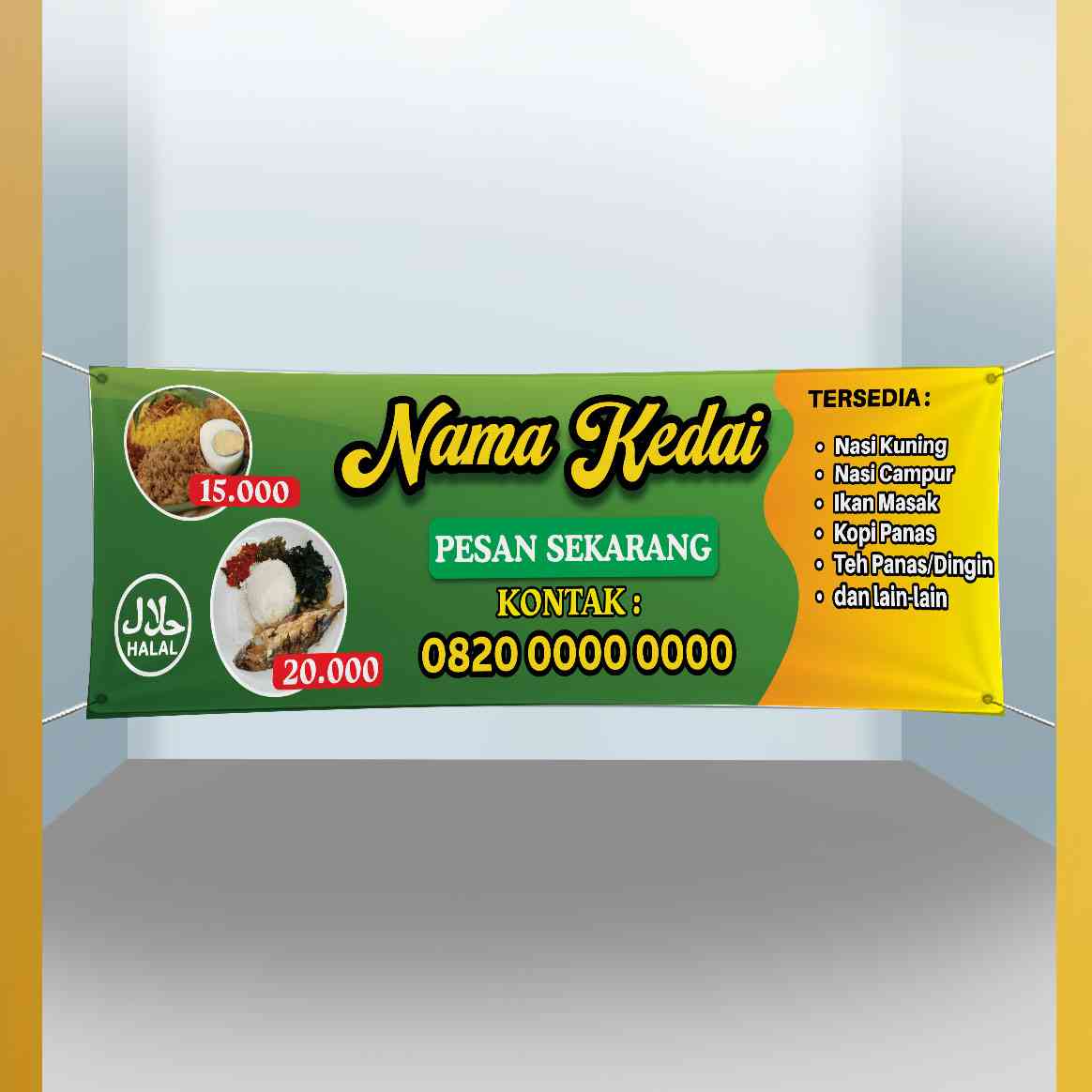 Desain ini cocok untuk spanduk promosi warung makan atau gerobak nasi kuning, ditujukan untuk menarik pelanggan dengan tampilan yang menggugah selera dan pesan promosi yang kuat.