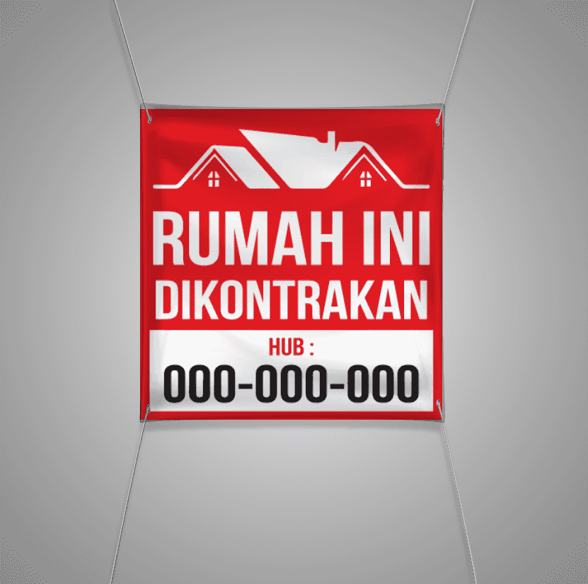 Spanduk "Rumah Ini Dikontrakan" ini memiliki desain mencolok dengan dominasi warna merah dan putih, membuatnya mudah terlihat dari kejauhan. Tulisan "...