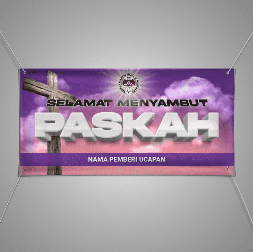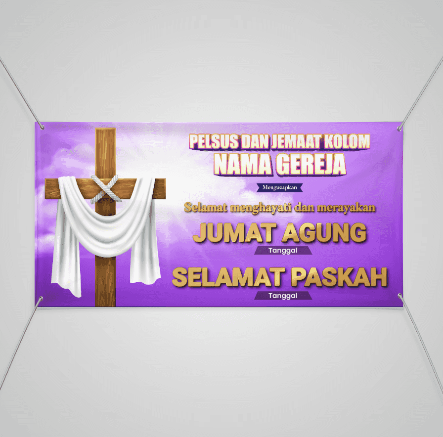 Spanduk Paskah dan Jumat Agung ini memiliki desain yang khas dengan latar belakang nuansa ungu, warna yang sering dikaitkan dengan refleksi dan spirit...